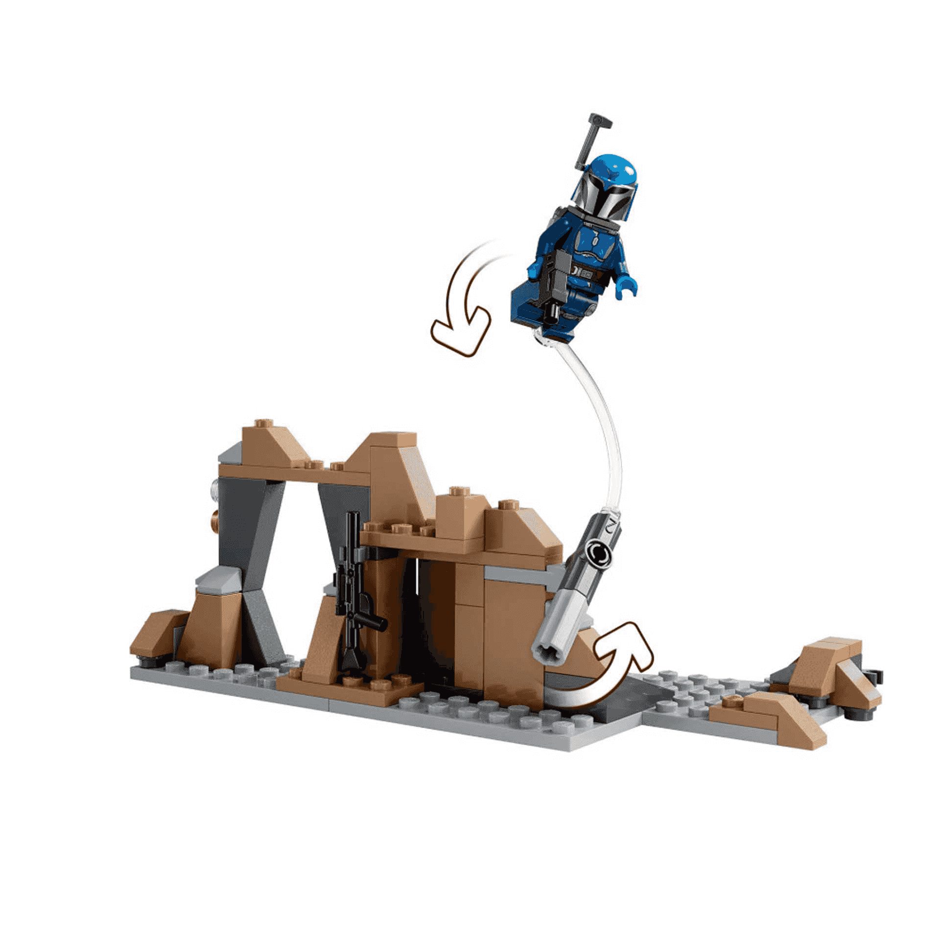 Incluye montones de accesorios LEGO, como blásteres, pistolas bláster y mochilas propulsoras, además de un elemento transparente con un mango para que la minifigura LEGO ´vuele´. Una formación rocosa con una cueva y un cañón que dispara aportan aún más posibilidades de juego. Descubre con tu peque las instrucciones digitales y las herramientas de visualización de la app LEGO Builder. La formación rocosa/cueva puede conectarse a la base Mandaloriana del set Batalla entre Paz Vizsla y Moff Gideon (75386, a la venta por separado).