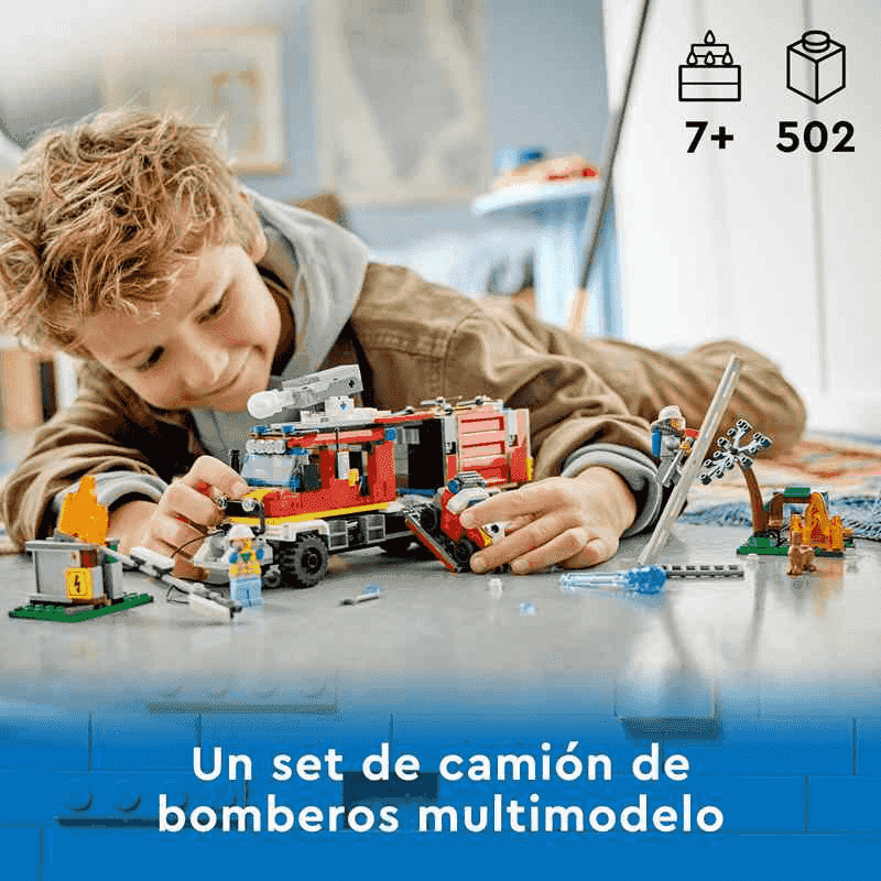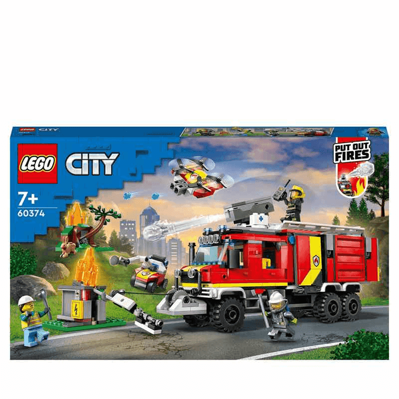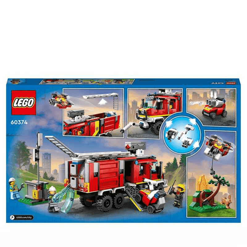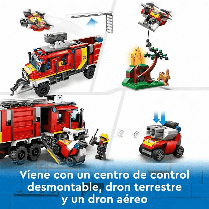 ¡Prende la chispa de la diversión en las sesiones de juego de tu peque con la Unidad Móvil de Control de Incendios LEGO® City (60374)! Este camión de bomberos cuenta con un centro de control desmontable, un dron de bomberos y un dron terrestre. Los niños podrán lanzar elementos que representan agua y espuma desde el camión y el dron de bomberos para sofocar las llamas. Incorpora las 3 minifiguras y las escenas de incendios en el bosque y la ciudad, ¡y todo listo para pasarlo genial durante horas en trepidantes aventuras! Construcción, juego y diversión para mayores de 7 años Este set LEGO viene con una guía de construcción paso a paso impresa y la app LEGO Builder: una guía interactiva con intuitivas herramientas de acercamiento y giro que permiten a los niños visualizar cada modelo mientras construyen. Juguetes que alimentan la creatividad Los sets LEGO City ofrecen a los peques detallados edificios, vehículos realistas y divertidos personajes para que ellos decidan las historias.