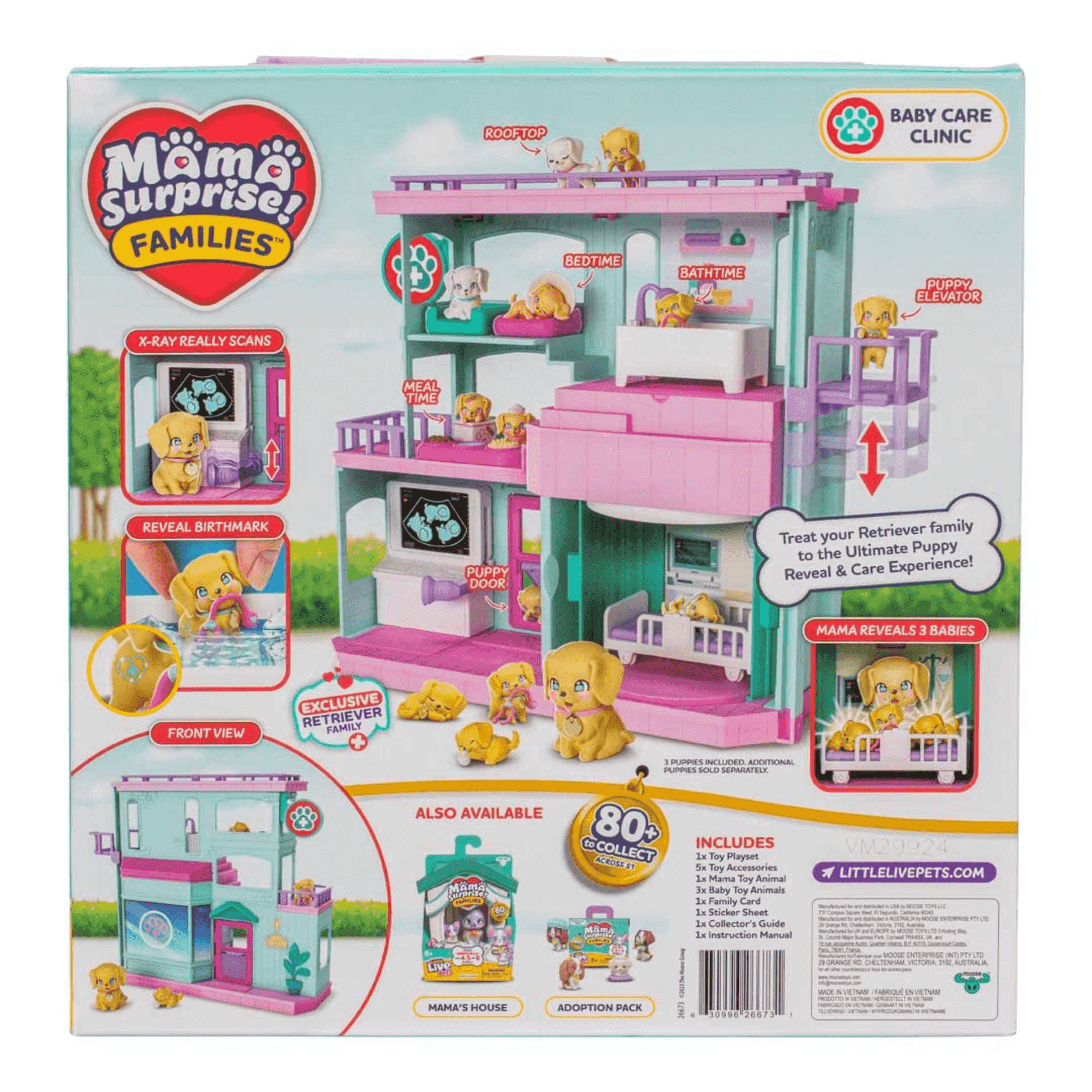 Descubre la Clínica de Cuidado de Bebés de Mama Surprise Families, donde la mamá perrita da a luz a 3 cachorros mágicos. Este set interactivo cuenta con una clínica de varios niveles y más de 80 accesorios coleccionables.