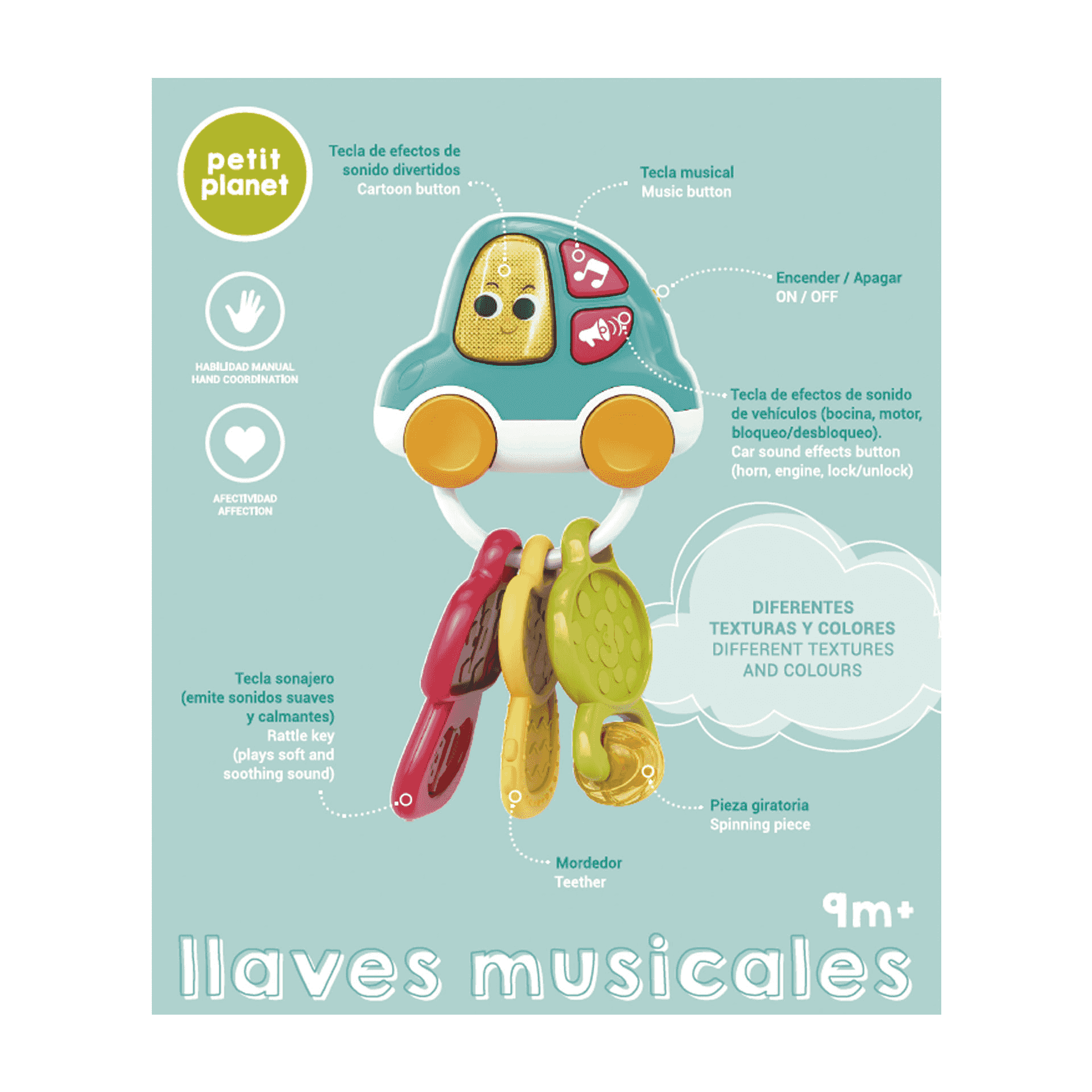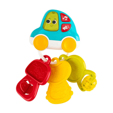 ¡Agita y diviértete con las llaves musicales para bebé! Este juguete estimulante ofrece diferentes texturas y colores vibrantes que captarán la atención de los más pequeños. Además, cuenta con efectos de sonido de vehículo, como el motor, la bocina y el bloqueo y desbloqueo, que harán que los bebés se diviertan mientras exploran el mundo que les rodea.