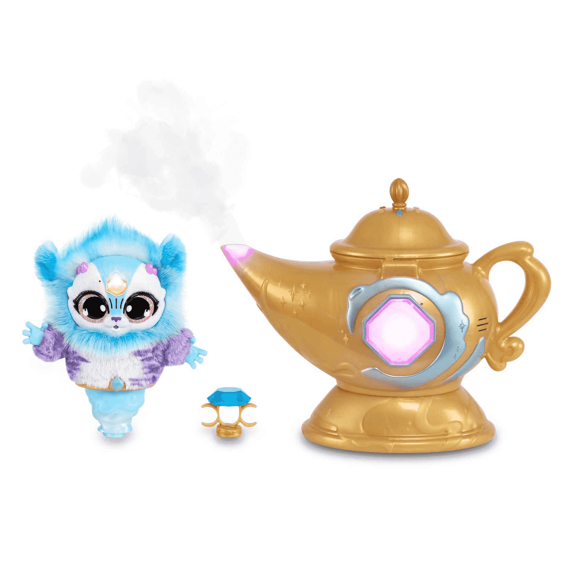 ¡El mundo mágico de Magic Mixies crece con la lámpara del genio! Comienza el conjuro, frótala 3 veces mientras introduces la contraseña. Poco a poco encontraras las piezas para construir tu propio anillo con una gema mágica que atraerá al genio y… ¡muchas sorpresas más!