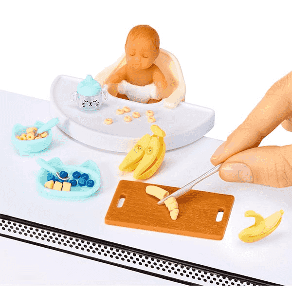 Este set lo tiene TODO para los fans de los juguetes coleccionables, creativos y adorables. Cada cápsula es una caja sorpresa que incluye un mini bebé súper mono y un conjunto de accesorios en miniatura con los que podrás preparar su comida. Desde cereales, plátanos y arándanos hasta mini cuchillos, tazas y boles con formas divertidas. ¡Y todo esto en una escala diminuta pero súper realista!