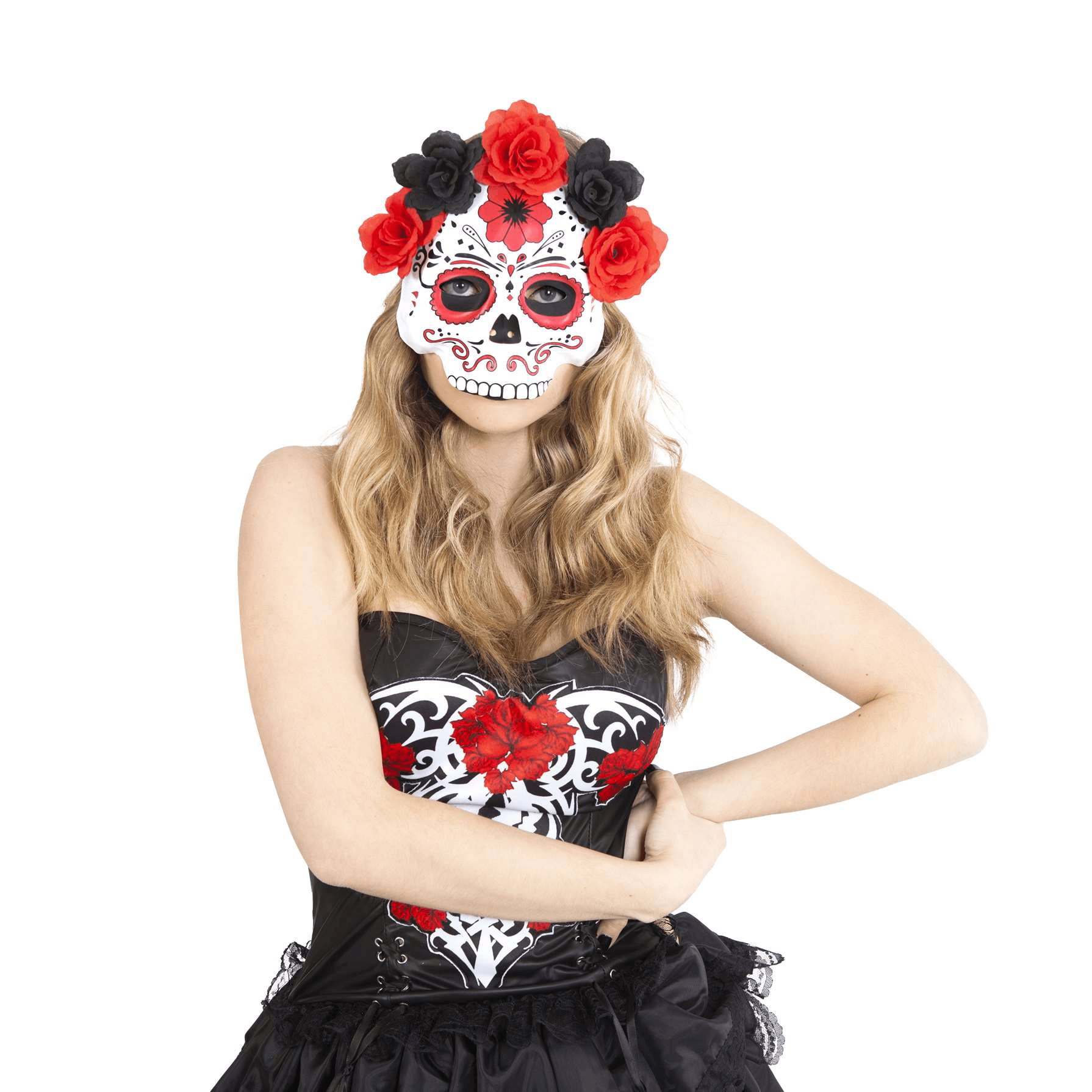 Máscara Katrina con Flores Rojas y Negras Complemento Disfraz