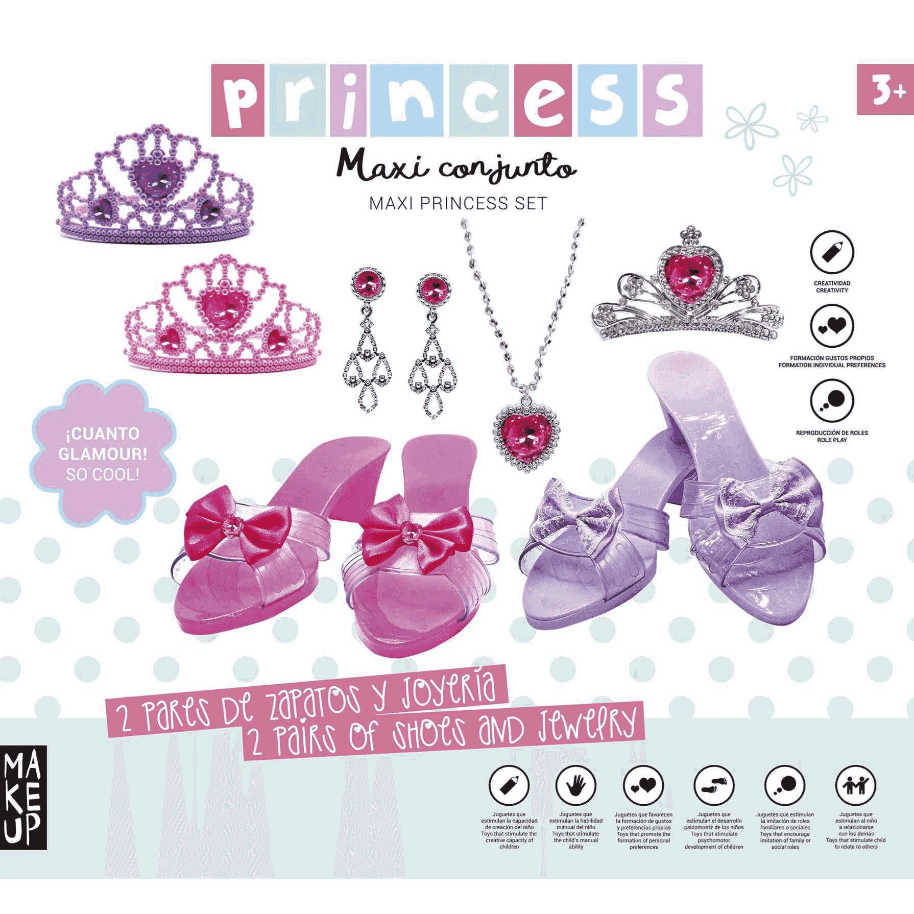 Con el maxi conjunto de gran glamour, los peques podrán lucir como auténticas estrellas de cine con 2 pares de zapatos, unas tiaras preciosas y joyería para estar muy guapos. ¡Conviértete en todo un referente de moda sacado de las mejores películas de todos los tiempos!