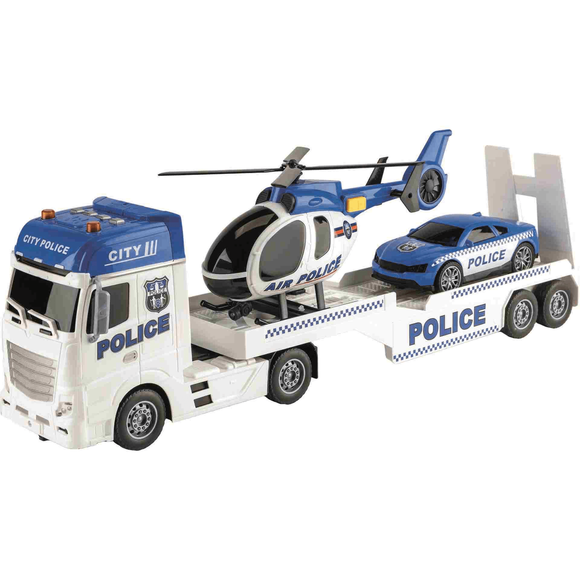 El camión tiene un diseño detallado y realista, con detalles como espejos laterales, neumáticos con relieve y una plataforma trasera con rampa. La plataforma trasera se puede bajar para cargar y descargar vehículos. El camión también tiene un botón que activa efectos de luz y sonido realistas. Estos sonidos simulan el ruido de un camión de rescate real en acción. El camión tiene un interruptor para elegir entre 3 sonidos diferentes de rescate.