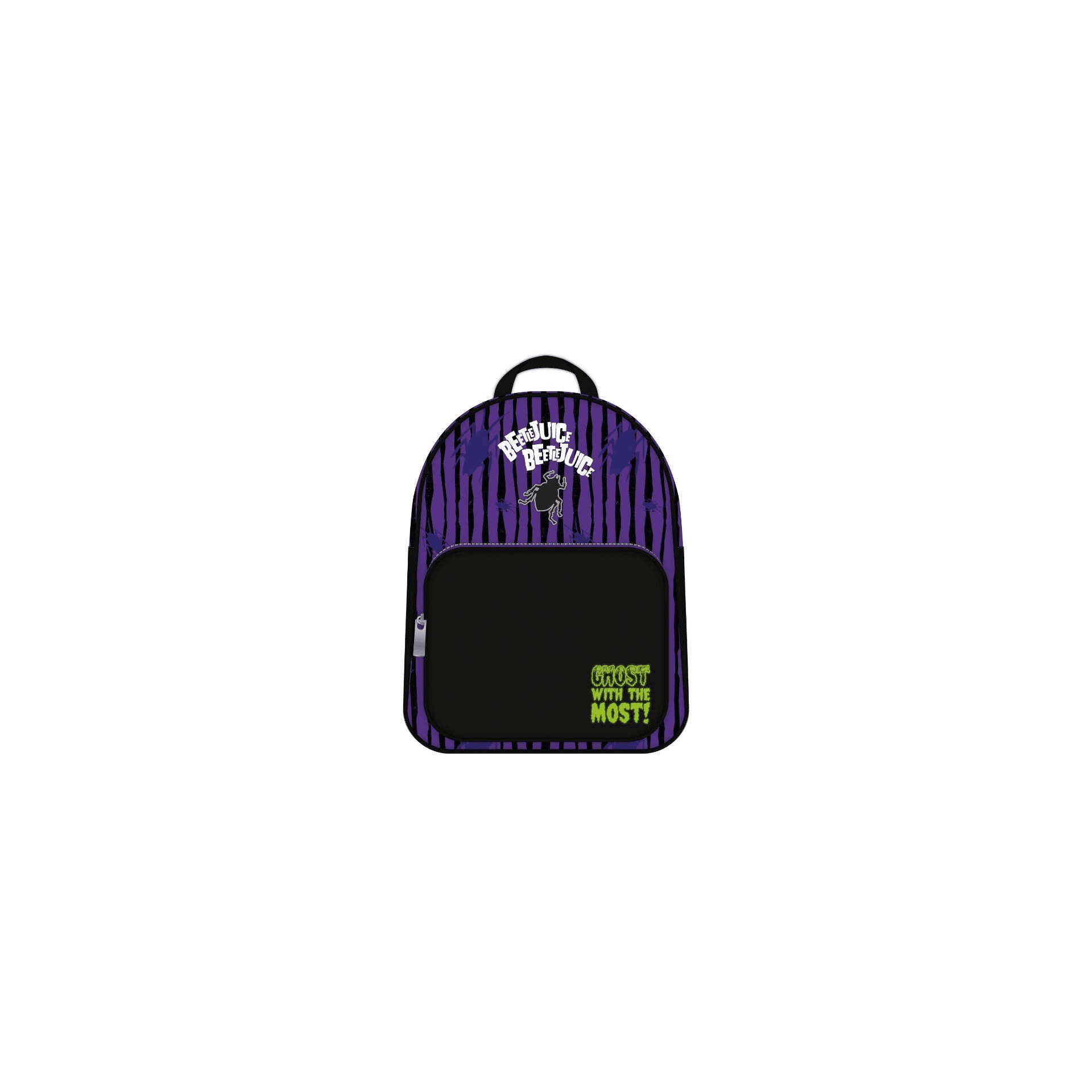 Con un diseño en tonos morado y negro, presenta el icónico logo de Beetlejuice y la frase ´Ghost with the Most´ en el bolsillo frontal.
