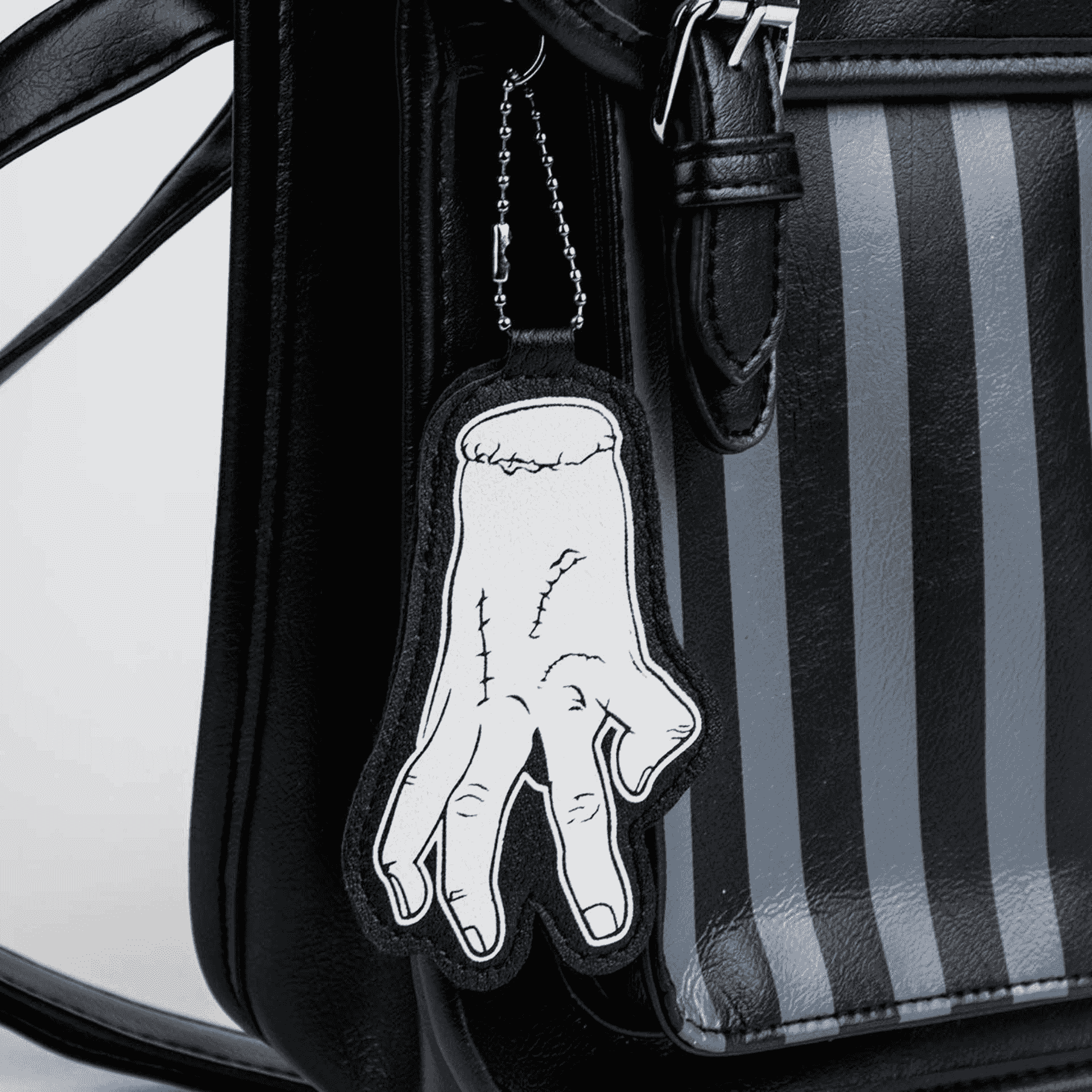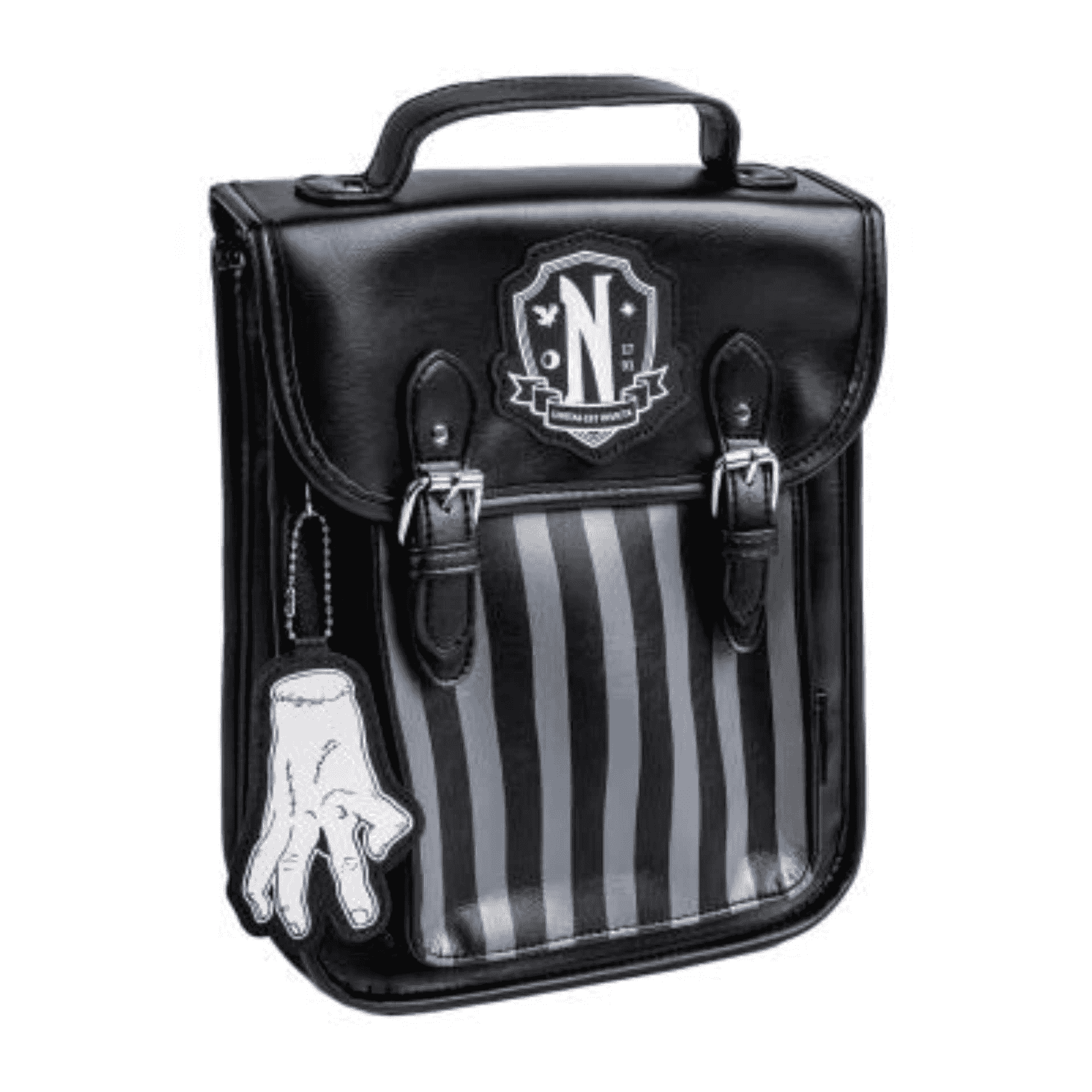 El diseño de la mochila presenta detalles que reflejan la estética gótica y misteriosa de Wednesday, con tonos oscuros y detalles sutiles que hacen referencia a su distintivo estilo. Las correas ajustables permiten un ajuste cómodo, mientras que el cierre de cremallera asegura que los objetos personales estén siempre protegidos.