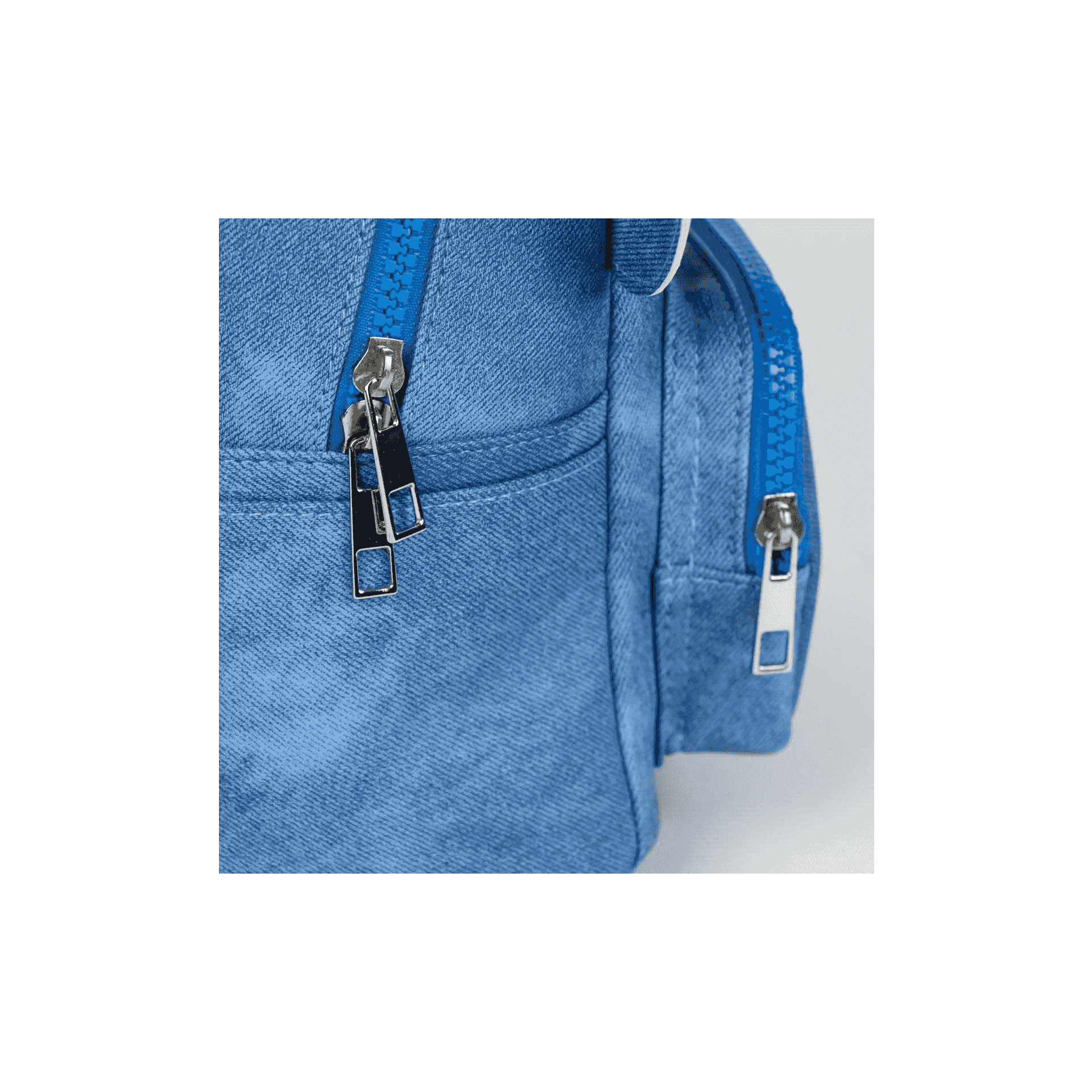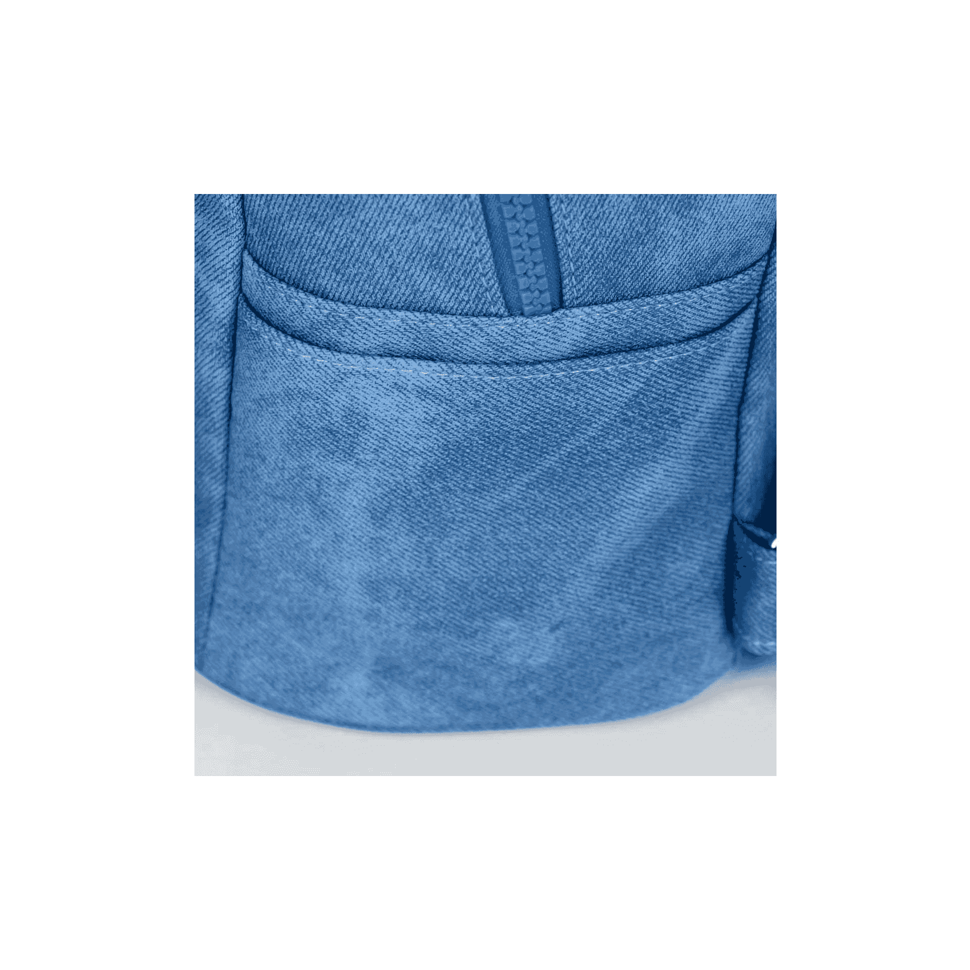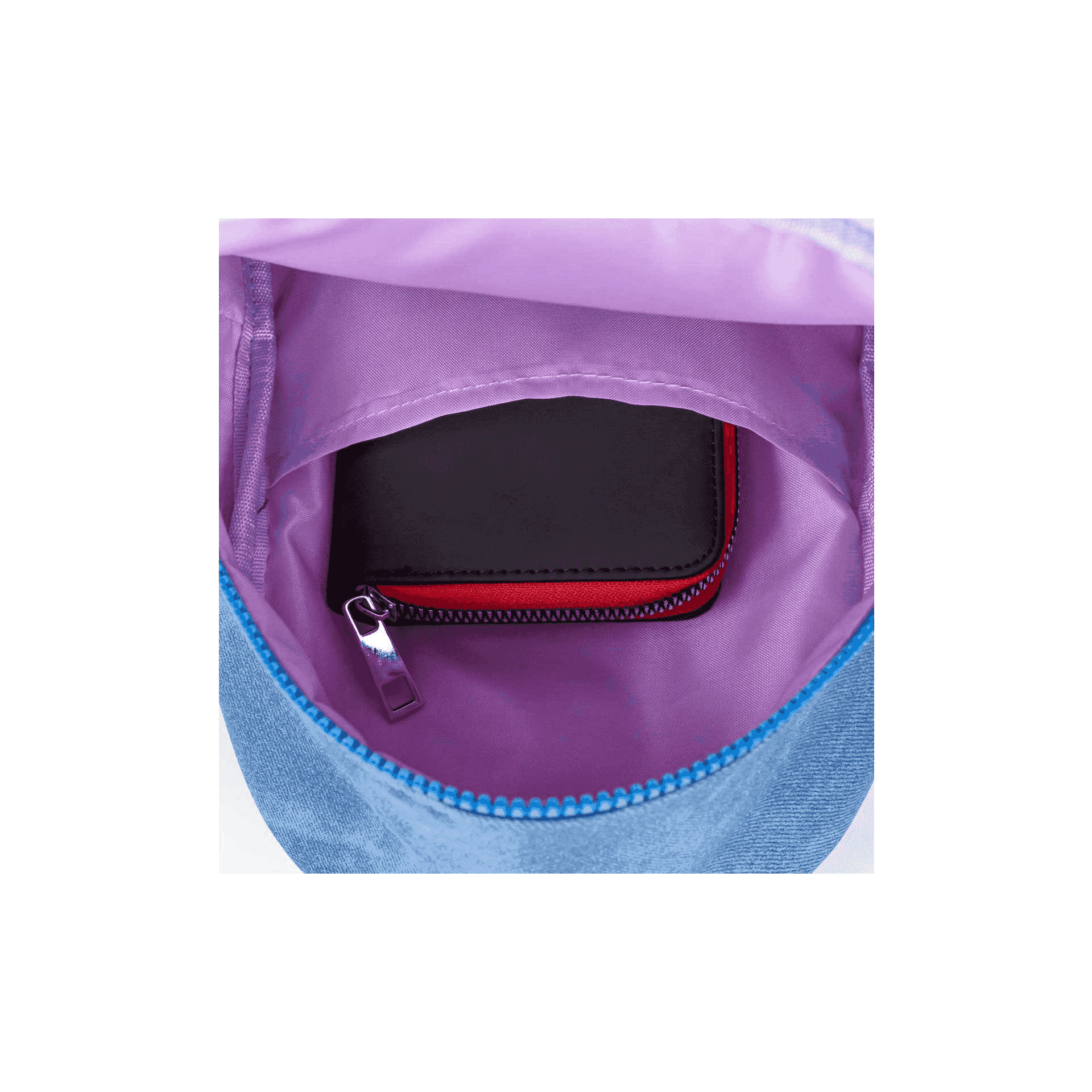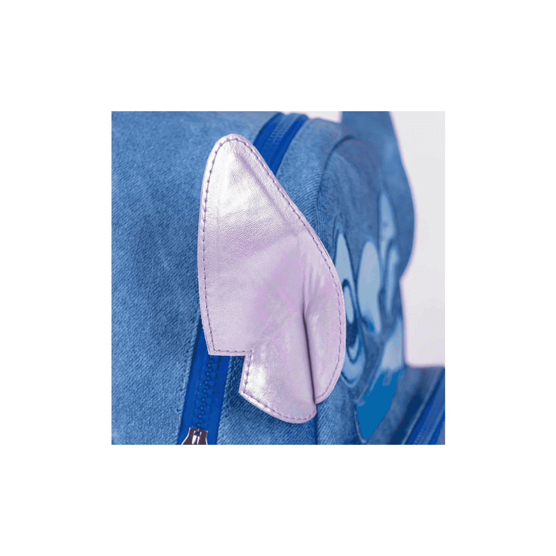 Esta mochila temática del personaje Stitch es principalmente de color azul y cuenta con detalles rosados en el interior de las orejas. En el bolsillo frontal, se puede ver un gran rostro bordado de Stitch, con sus orejas sobresaliendo a los lados y sus ojos y nariz prominentes. Debajo del rostro, la palabra ‘OHANA’ está bordada en una fuente cursiva, haciendo una emotiva referencia a la famosa cita sobre la familia de la película.