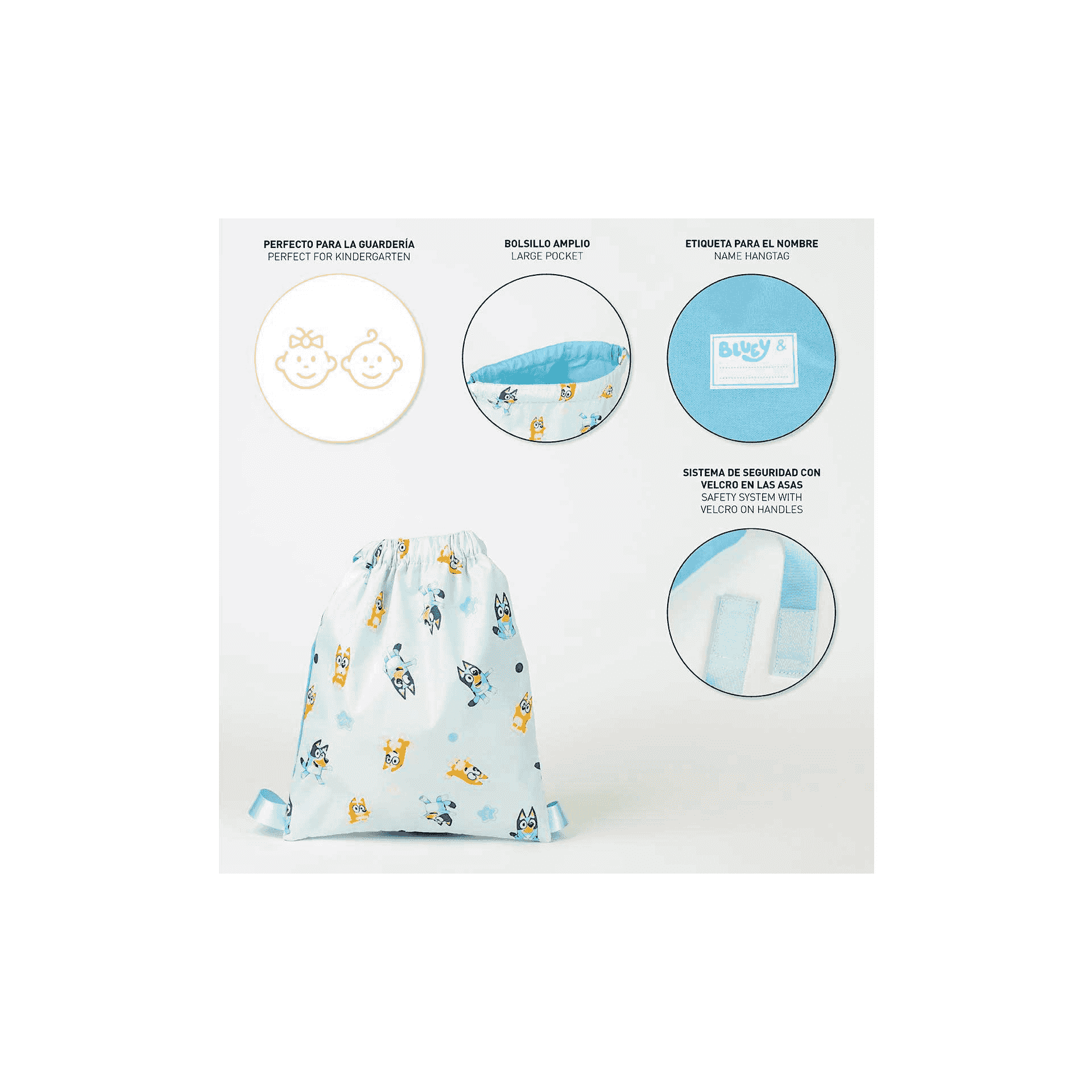 No pierdas la oportunidad de regalar a tu pequeño esta encantadora mochila saquito estampado de Bluey. ¡Perfecta para todas sus aventuras y salidas diarias!