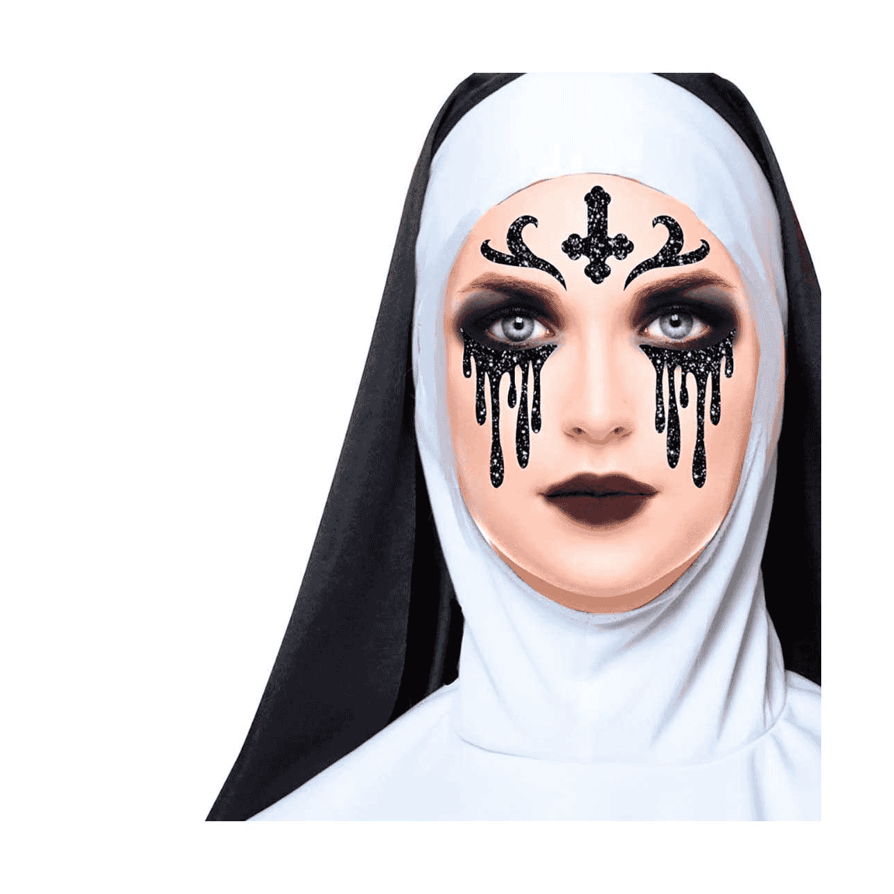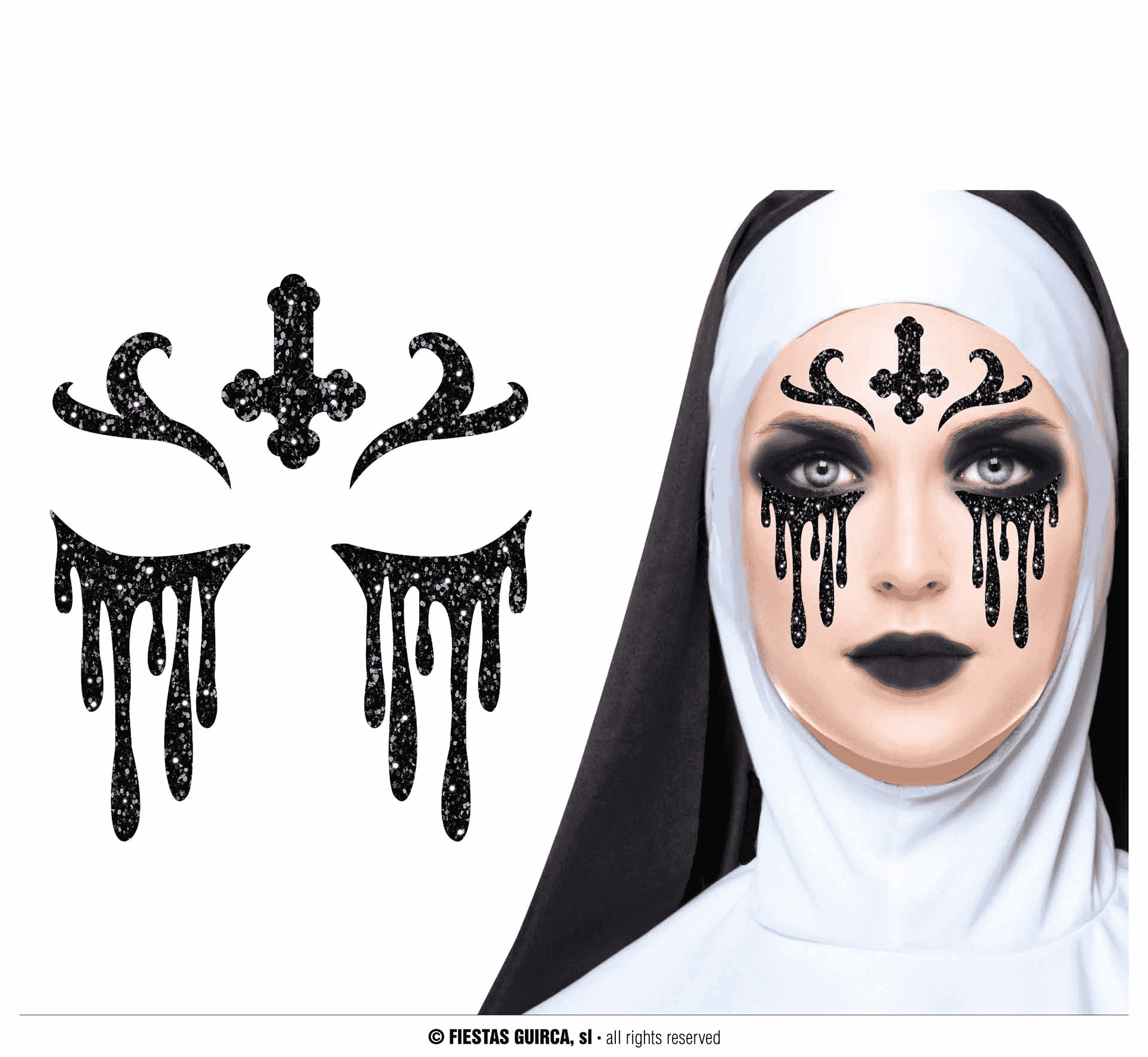 Decora tu rostro con el accesorio Monja Glitter Face. Perfecto para un look terrorífico y brillante en Halloween. Fácil de aplicar y quitar. ¡Ideal para destacar!