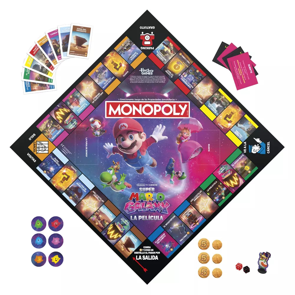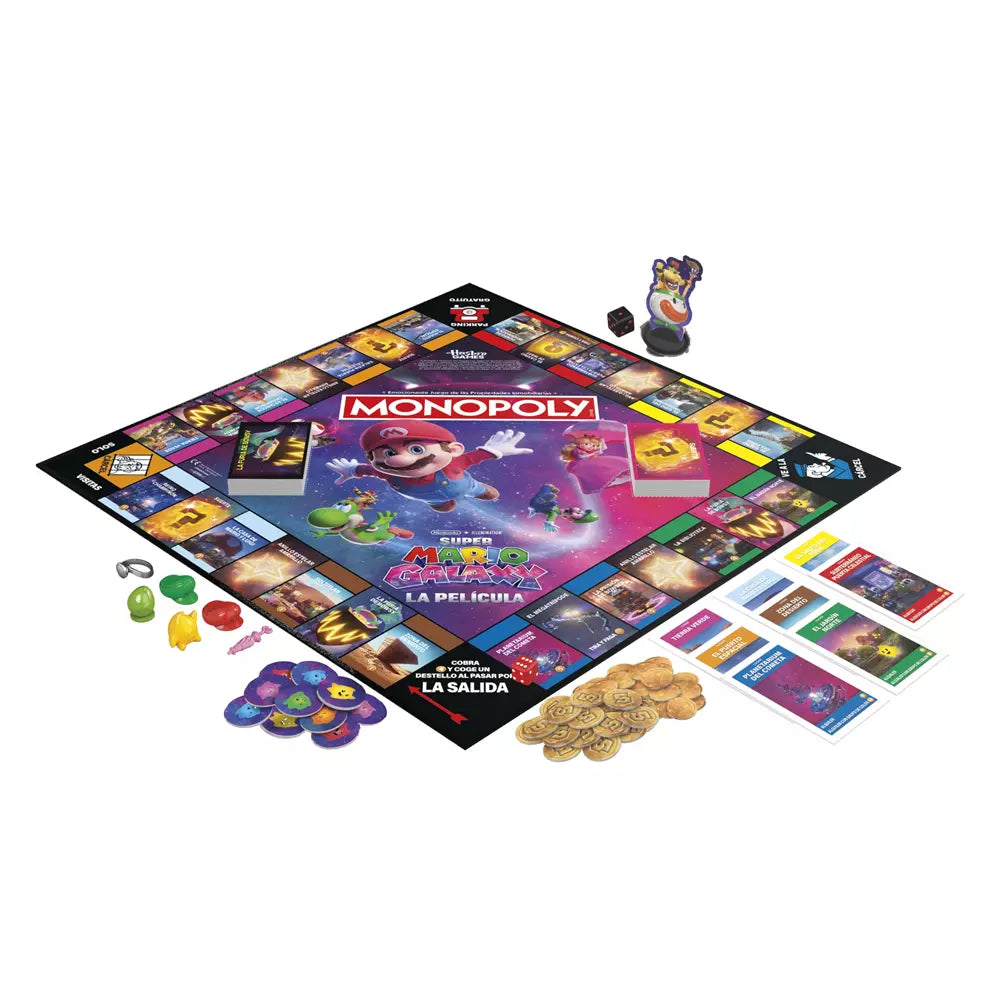 ¿Qué es y qué incluye? Es un juego de mesa familiar de Hasbro que adapta la mecánica clásica de Monopoly al mundo de Super Mario Galaxy. El tablero representa distintas galaxias y localizaciones de la película, hay cartas especiales, fichas esculpidas en plástico con motivos del universo Mario, fichas Luma como recurso, monedas y los elementos tradicionales de Monopoly adaptados al tema cinematográfico. La presentación incluye un tablero a todo color, cartas de propiedad, pilas de fichas Luma, monedas, peones temáticos y un contador/elemento de Bowser Jr. para las interacciones especiales. Información concreta sobre materiales o número exacto de componentes aparece en el embalaje: Información no disponible si no figura en la caja.
