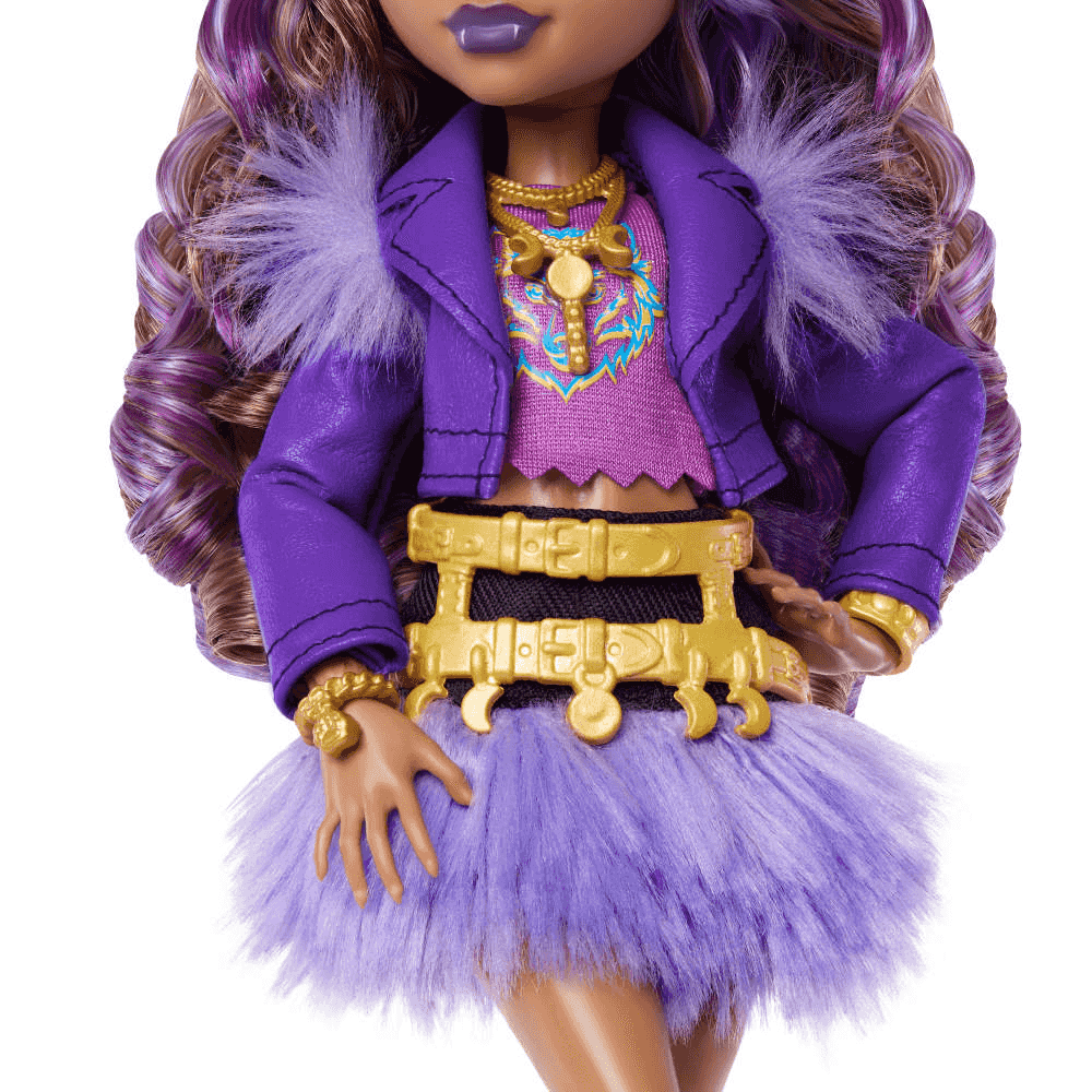 Clawdeen luce una chaqueta motera morada y una falda de pelo que reflejan su personalidad feroz y fashion. Viene acompañada de siete accesorios que completan su estilo, como un libro, un cruasán y un bolso, ideales para inventar historias llenas de detalles.