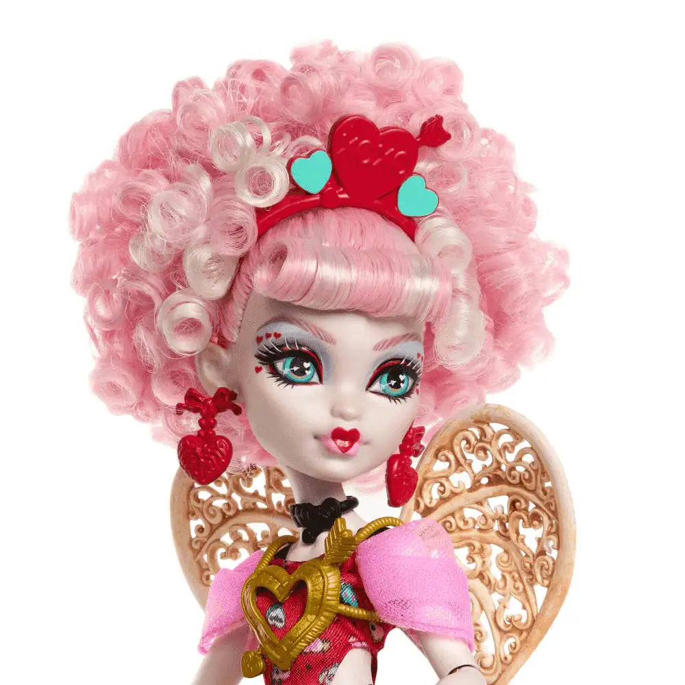Cupid Asteria desborda amor con un look rosa y rojo, alas de hueso y accesorios de fiesta. Perfecta para historias de amistad y celebraciones en Monster High.