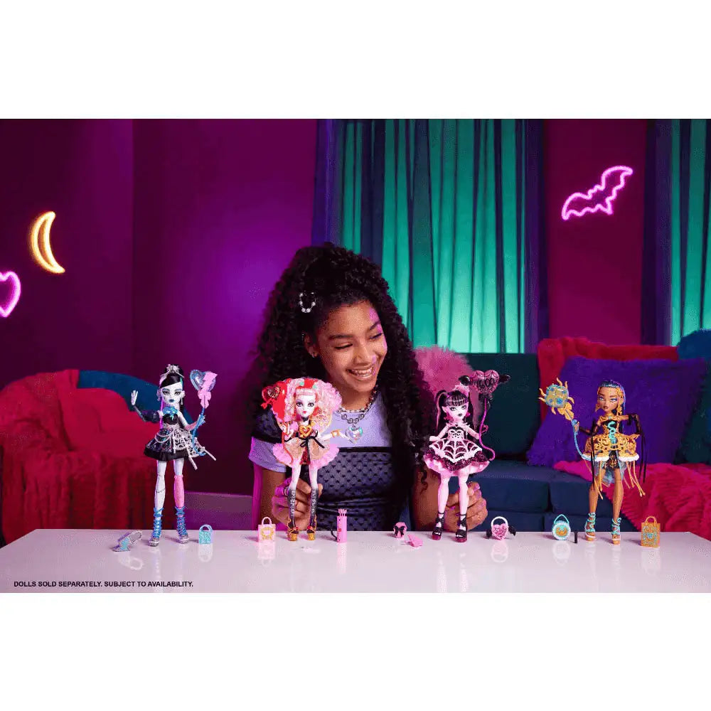 Draculaura celebra con un vestido rosa satinado, falda telaraña superpuesta y guantes negros. Incluye accesorios de fiesta para una noche fantabulosa.