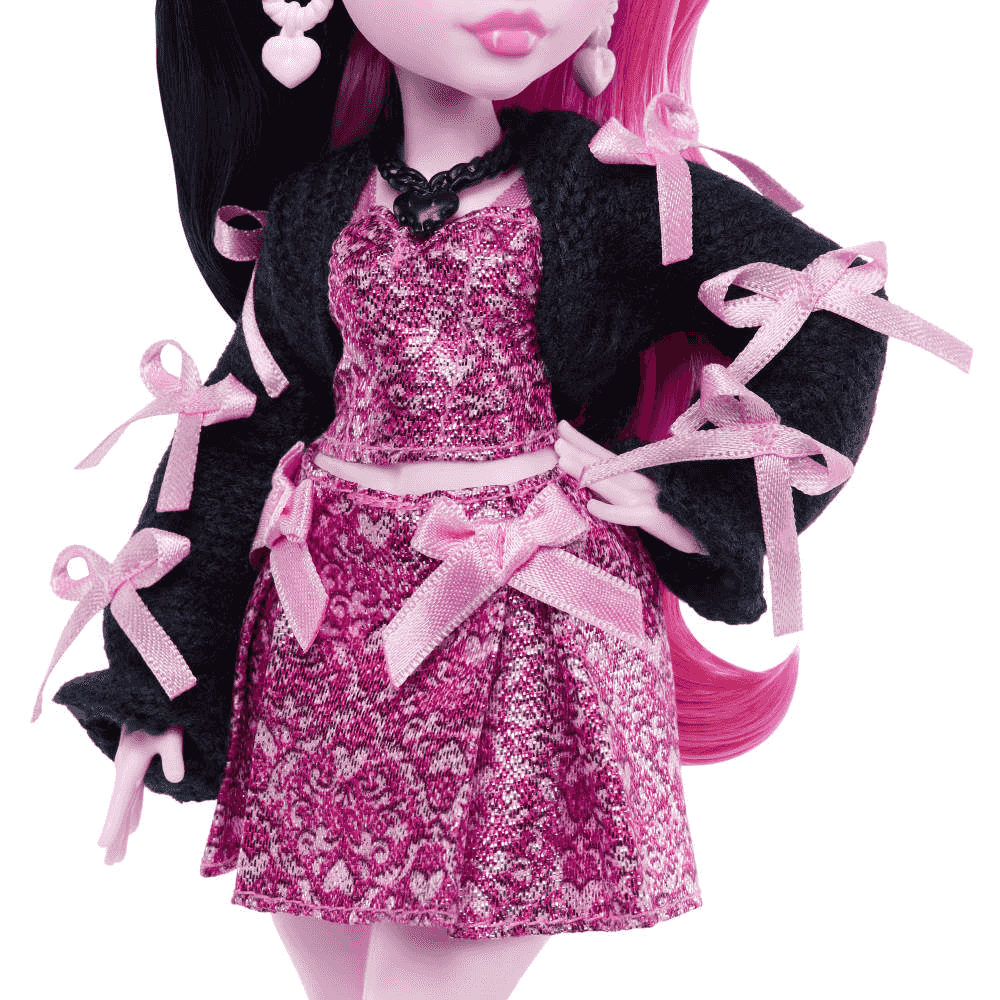 Draculaura luce un vestido rosa con lazo y un cárdigan negro, acompañados de siete accesorios que completan su estilo, como ramen, pintalabios y bolso, perfectos para inventar historias llenas de detalles.