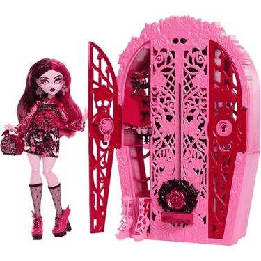 - Armario revelador: El set incluye un armario especial que, al ser desbloqueado con un talismán, revela a Draculaura en todo su esplendor. Este armario también sirve para almacenar la muñeca y sus accesorios, facilitando el orden y la portabilidad.