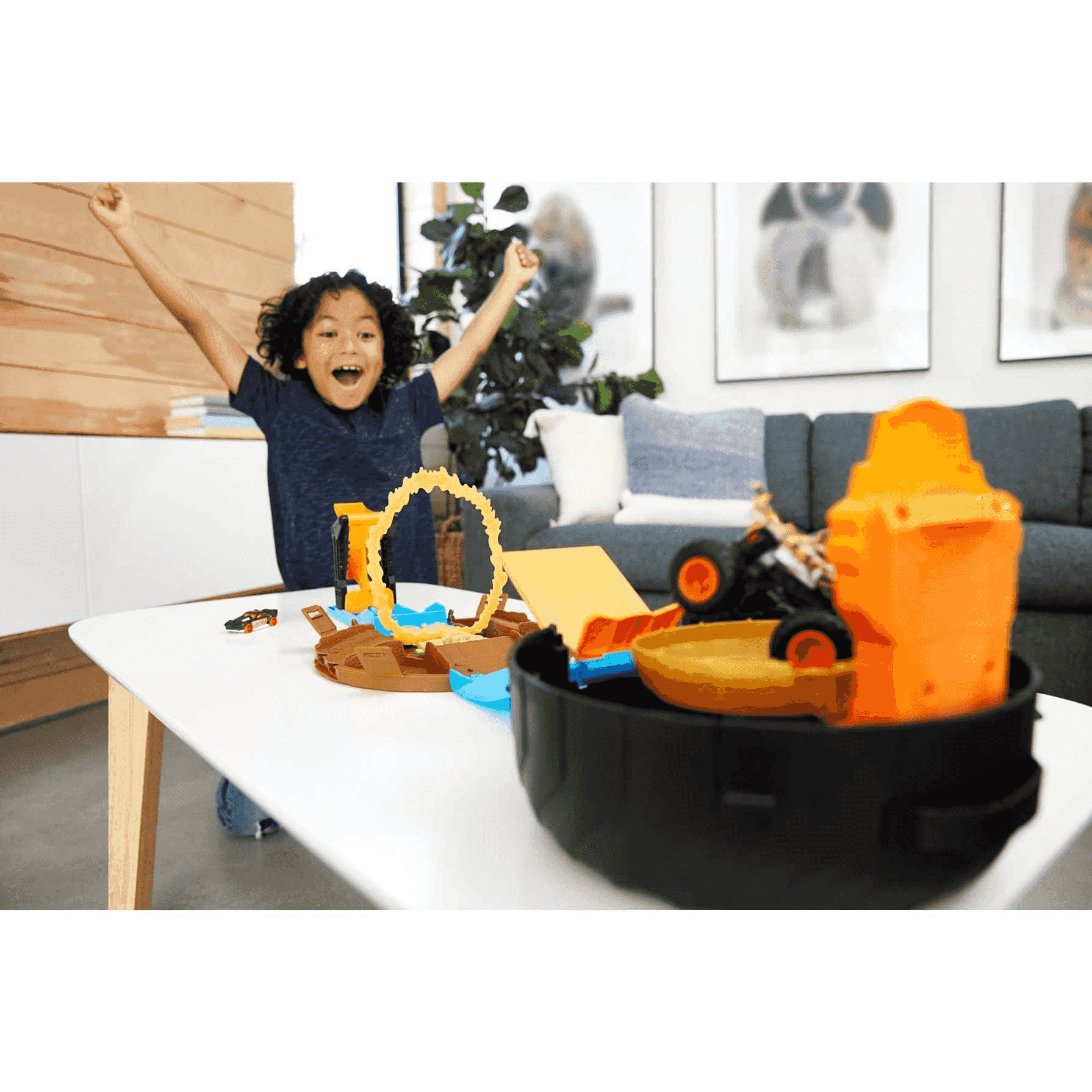 Incluye el Monster Truck Tiger Shack y un vehículo a escala 1:64 de Hot Wheels®.