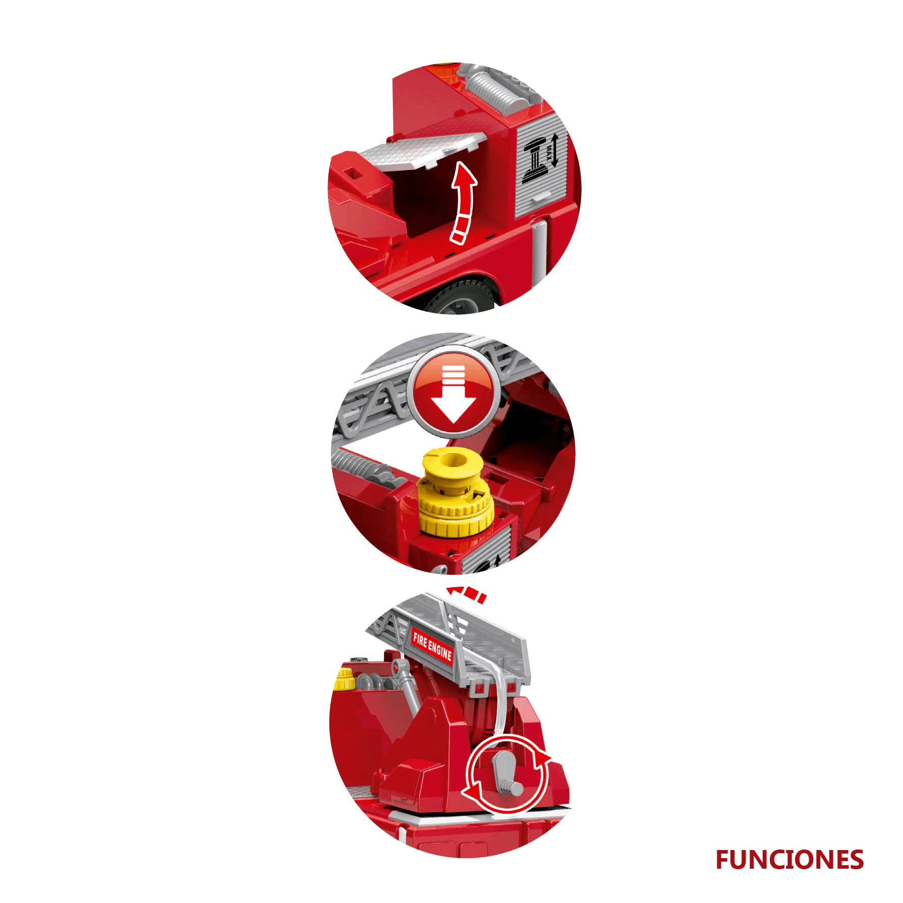 Podrás realizar muchas funciones para que el juego sea más realista, por ejemplo, el Camión de Bomberos cuenta con un sistema de fricción y una bomba de aire para convertirse en un juguete versátil. La luz y el sonidos se activarán cuando tu hijo o hija presione los botones para activar las luces y sonidos del juguete. La escalera subirá y bajará gracias a una palanca que hay que girar para que active tal movimiento. Además también tiene una trampilla que se abre.