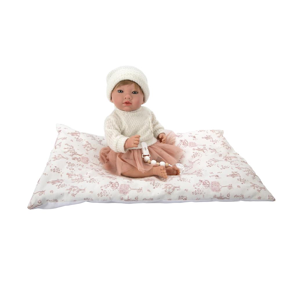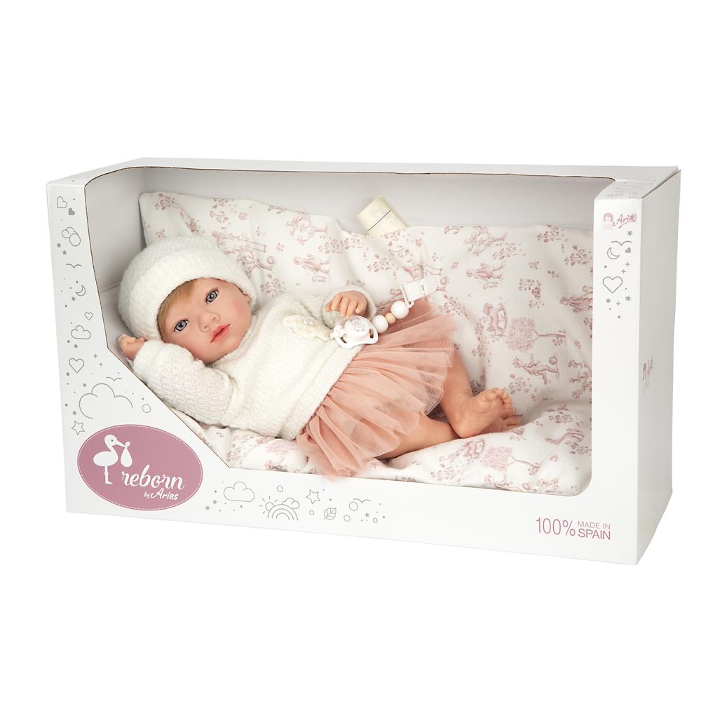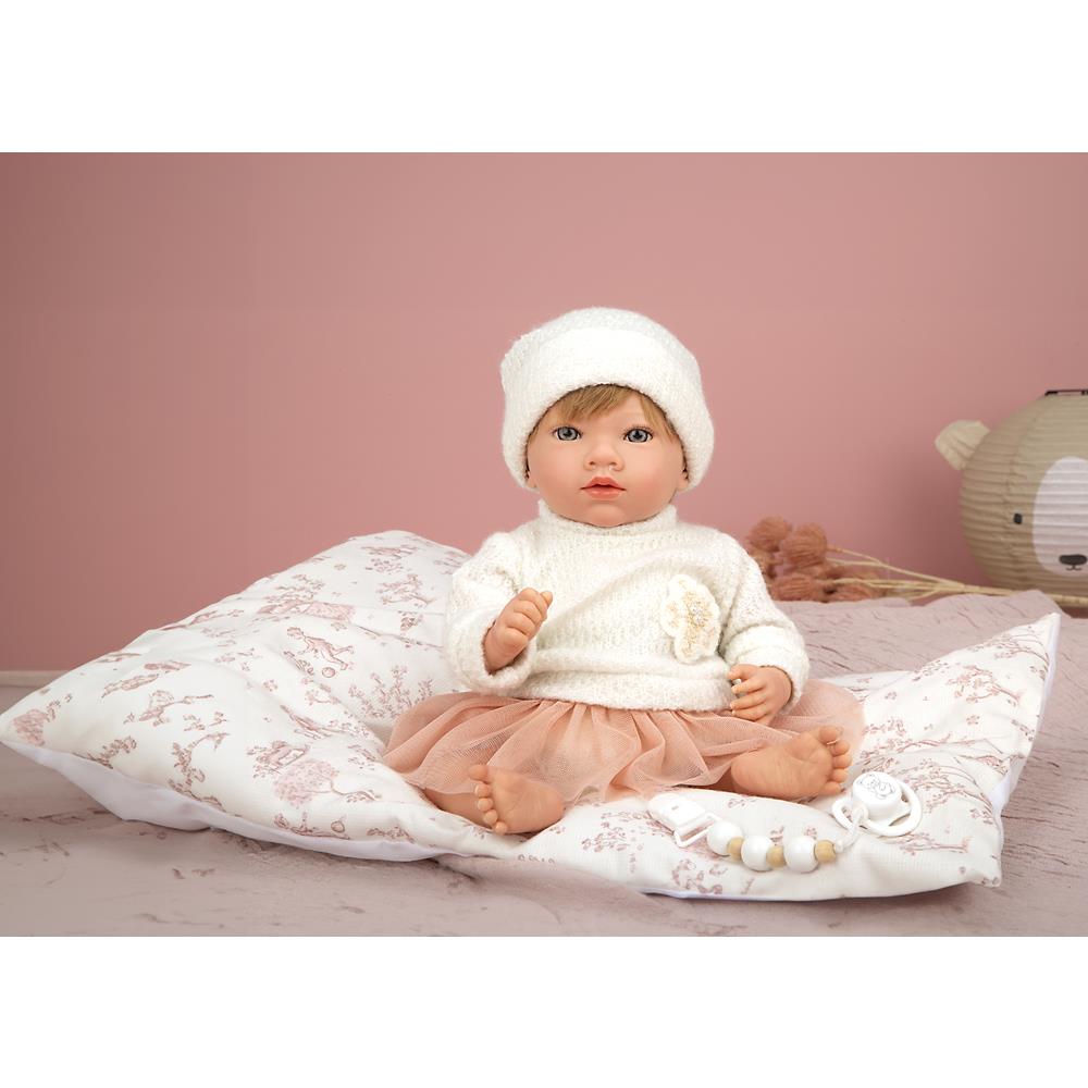 Julia viste un conjunto en tonos rosa y blanco fabricado con tejidos de alta calidad. Viene acompañada de un bonito cojín estampado, chupete con chupetero, pañal, libro de familia y un certificado de autenticidad que realza el valor de colección. Además, su aroma sutil a vainilla añade una experiencia sensorial única en cada caricia.