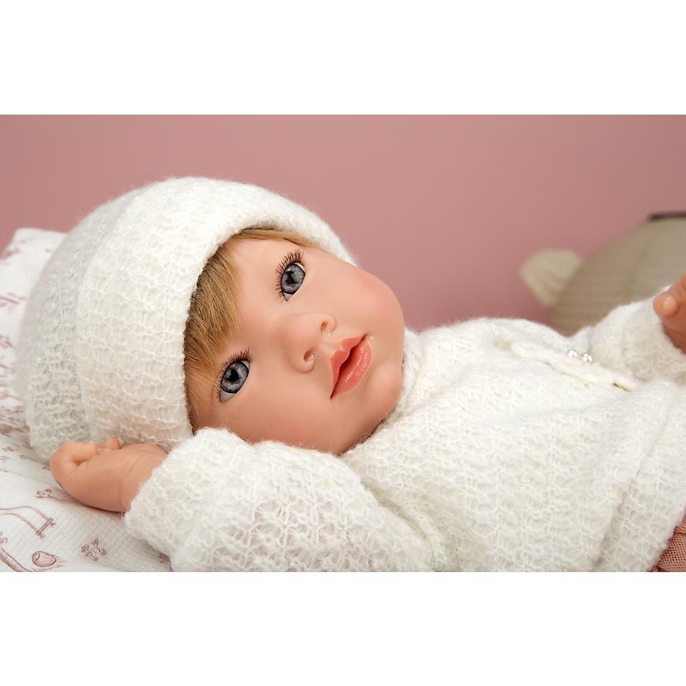 Su cuerpo de vinilo suave y articulado está diseñado con realismo excepcional: pequeñas sonrisas, rubor en las mejillas, delicadas venitas y uñas pintadas le dan vida propia. Su peso y estabilidad imitan el abrazo real de un bebé, perfecto para sentir el mimo desde el primer contacto.