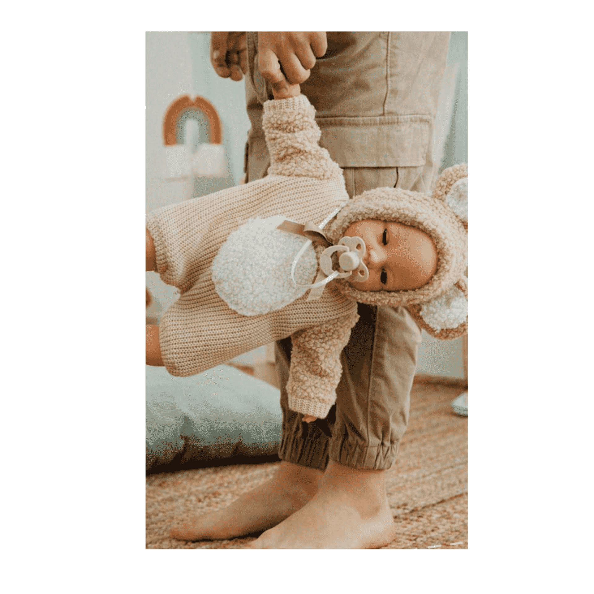 - Diseño adorable: Bimba viste un suave pijama de osito con capucha y orejitas, que la hace aún más entrañable.