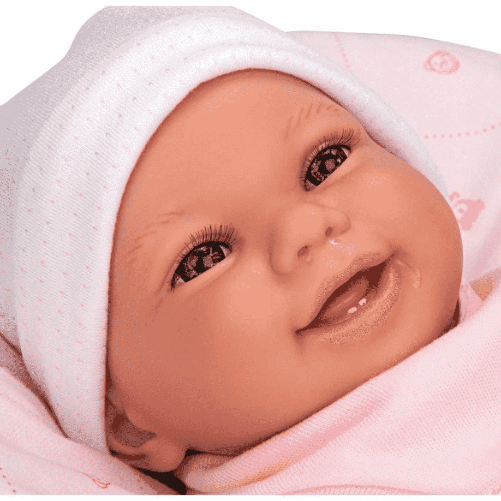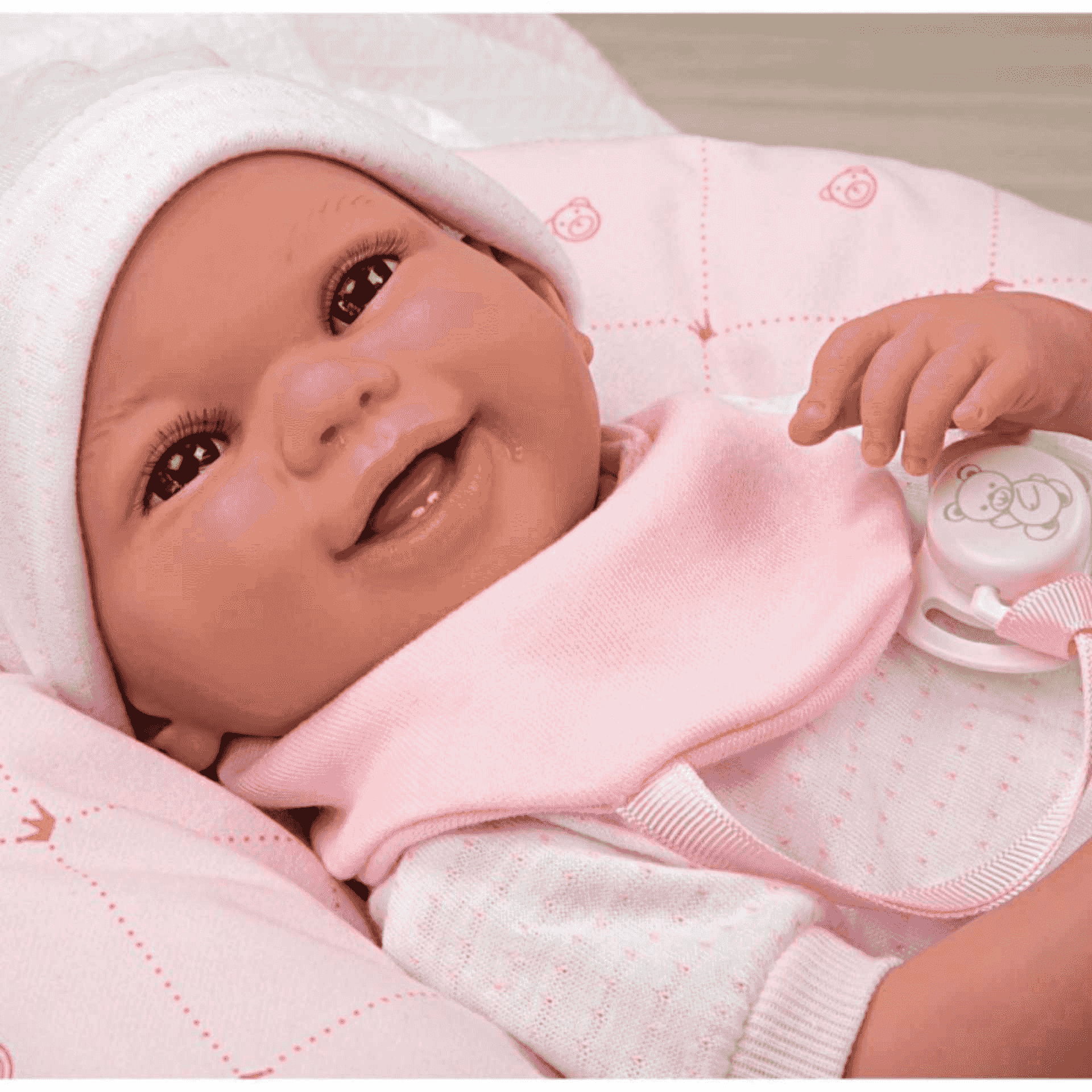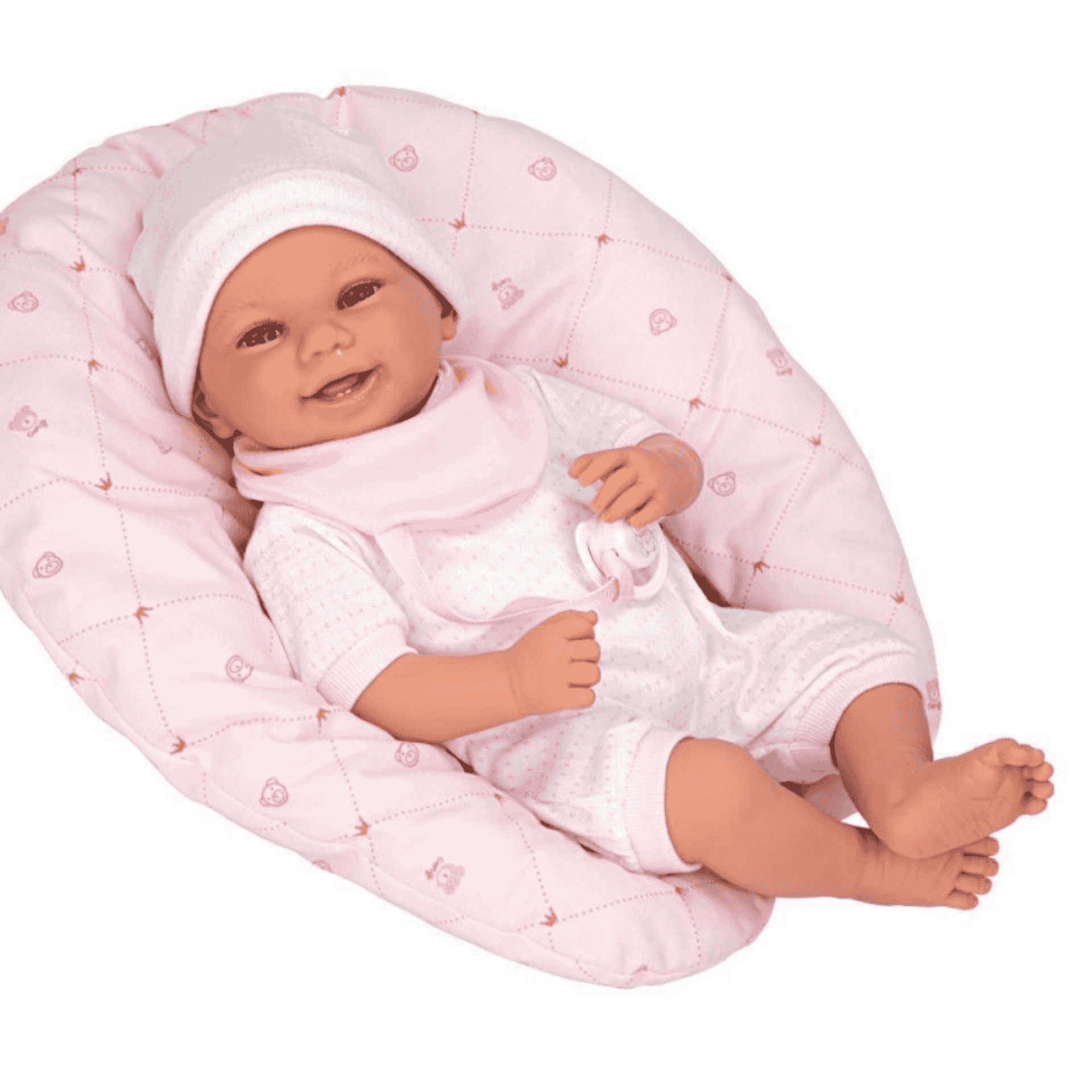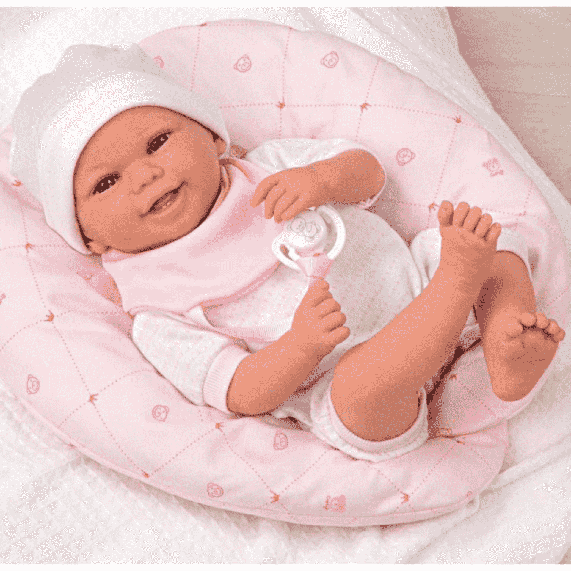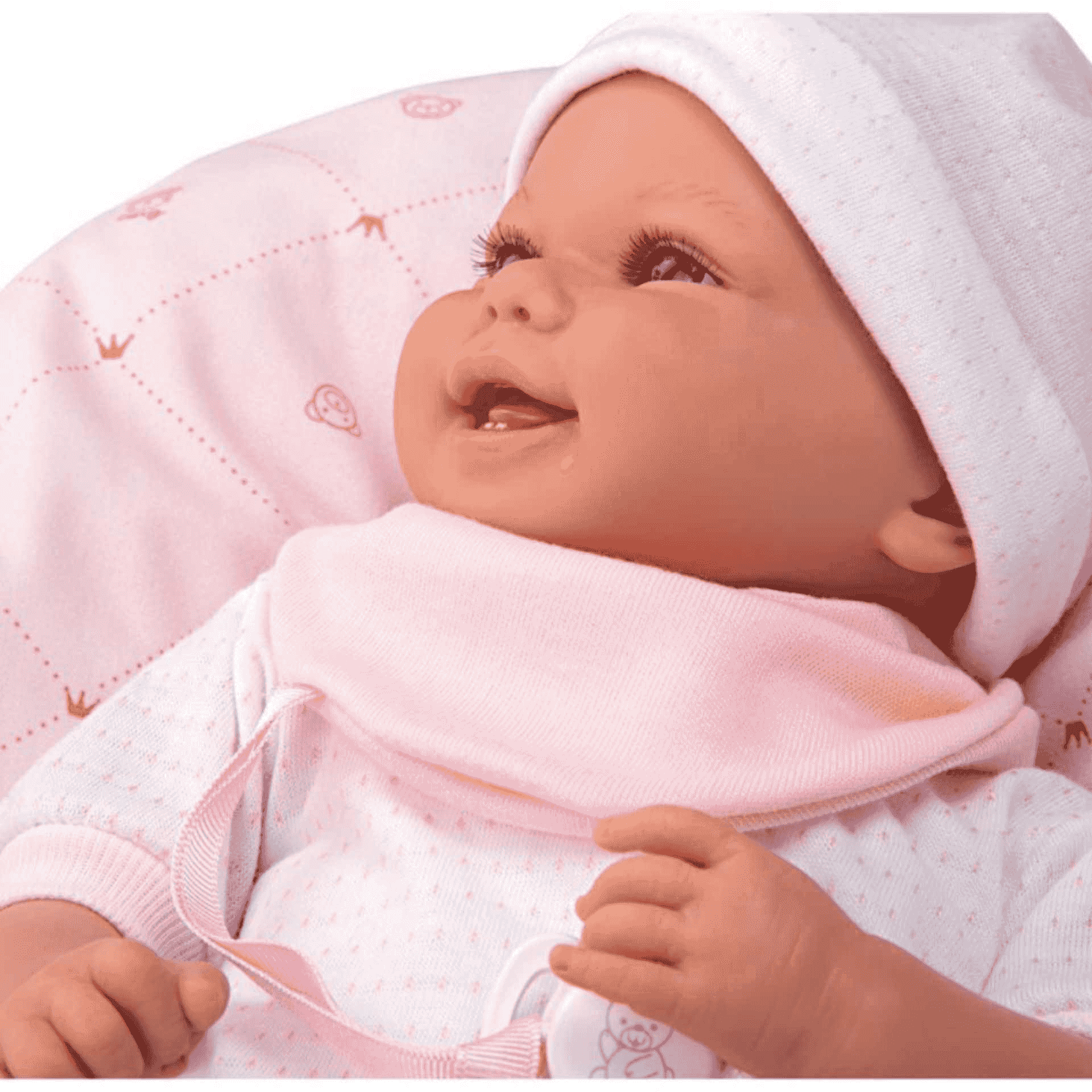 - Accesorios Incluidos: La muñeca viene acompañada de un chupete y un cojín rosa, añadiendo realismo y permitiendo a los niños cuidar y mimar a su bebé.