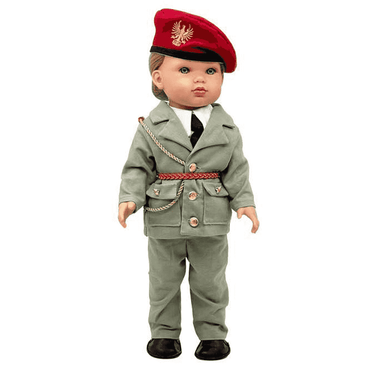 La muñeca viste el uniforme oficial del ejército español, cuidadosamente confeccionado con detalles auténticos que reflejan fidelidad y respeto a la tradición militar. Su rostro, esculpido y pintado a mano, transmite elegancia y carácter, y está realizado con materiales de calidad premium característicos de Antonio Juan.