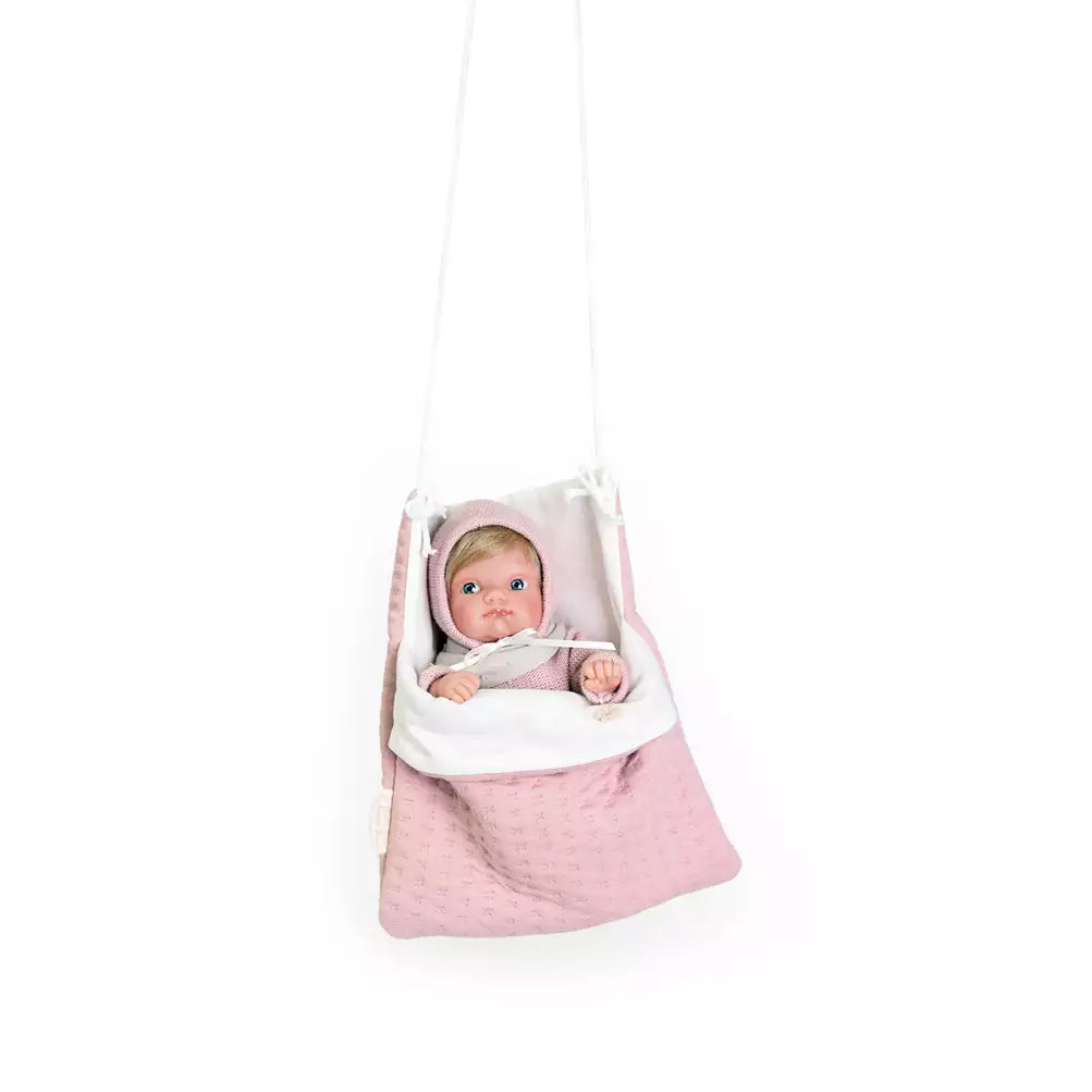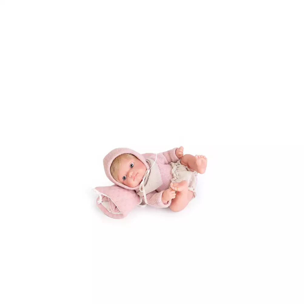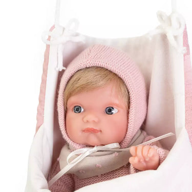 - Vestimenta Detallada: La muñeca viene vestida con un bonito jersey, culotte y babero a juego, complementados con un gorro que resalta su dulzura.