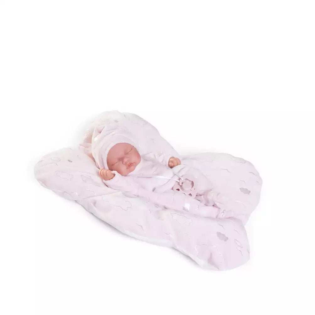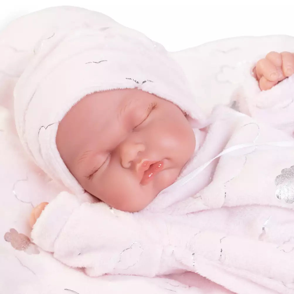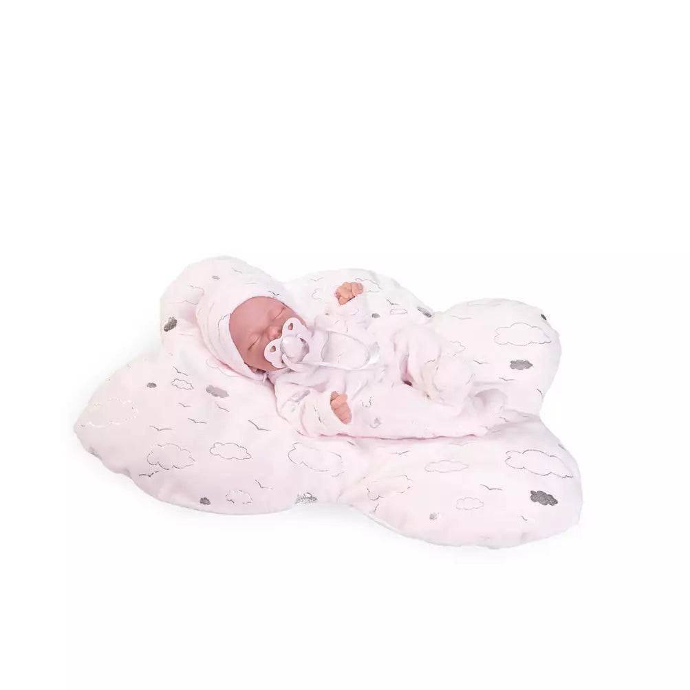 - Vestimenta Encantadora: Viene vestida con un pijama y gorrito a juego en tonos suaves, complementados con un cojín con diseño de nubes, creando una estampa de ensueño.