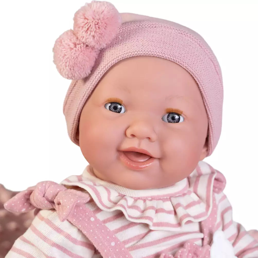 Mia es una adorable muñeca recién nacida de Antonio Juan que hace pipí cuando le das su biberón, haciendo que el juego sea aún más realista. Si la acuestas, cerrará los ojos como un bebé de verdad, lista para dormir plácidamente después de un día lleno de mimos y cuidados.