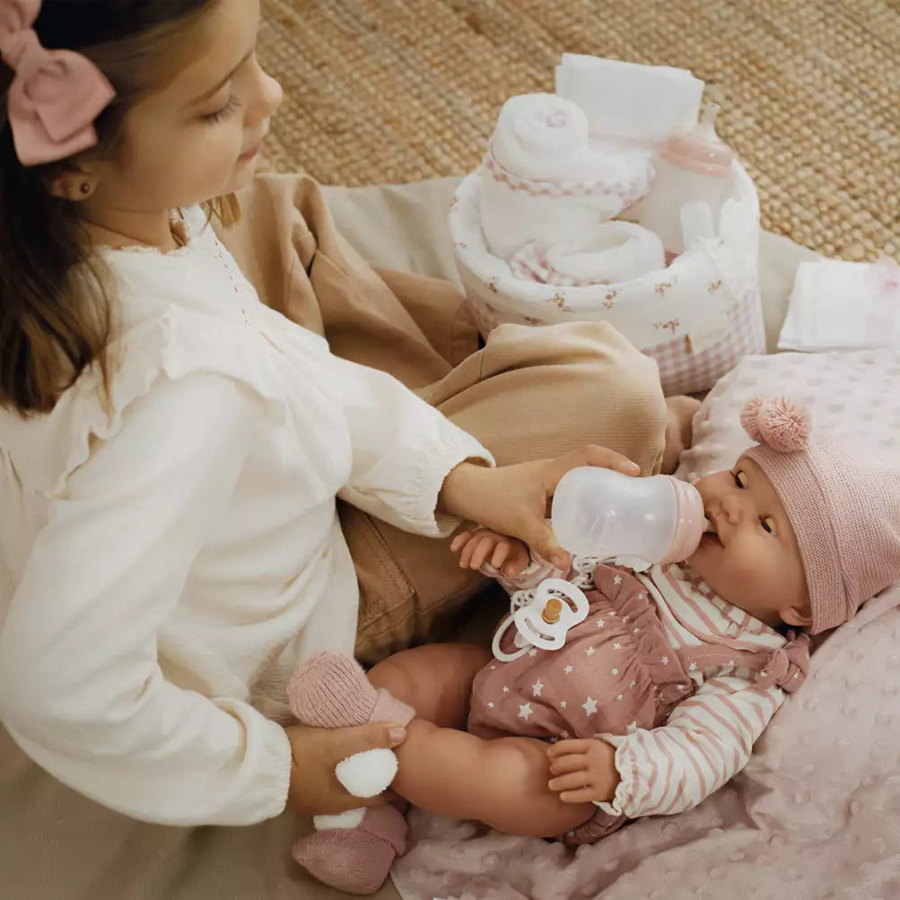 Con Mia, los niños y niñas podrán darle el biberón, cambiarle el pañal y acostarla a dormir, fomentando el juego simbólico y el desarrollo del cuidado y la empatía. Su diseño realista y sus accesorios detallados hacen que cada momento de juego sea especial.