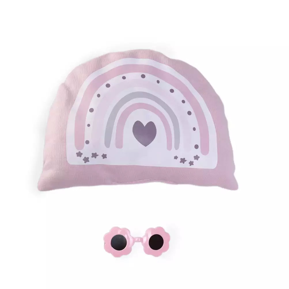 - Vestimenta Divertida: Luce un encantador pelele con dibujos de arcoíris y un gorro a juego que le da un toque travieso y adorable.