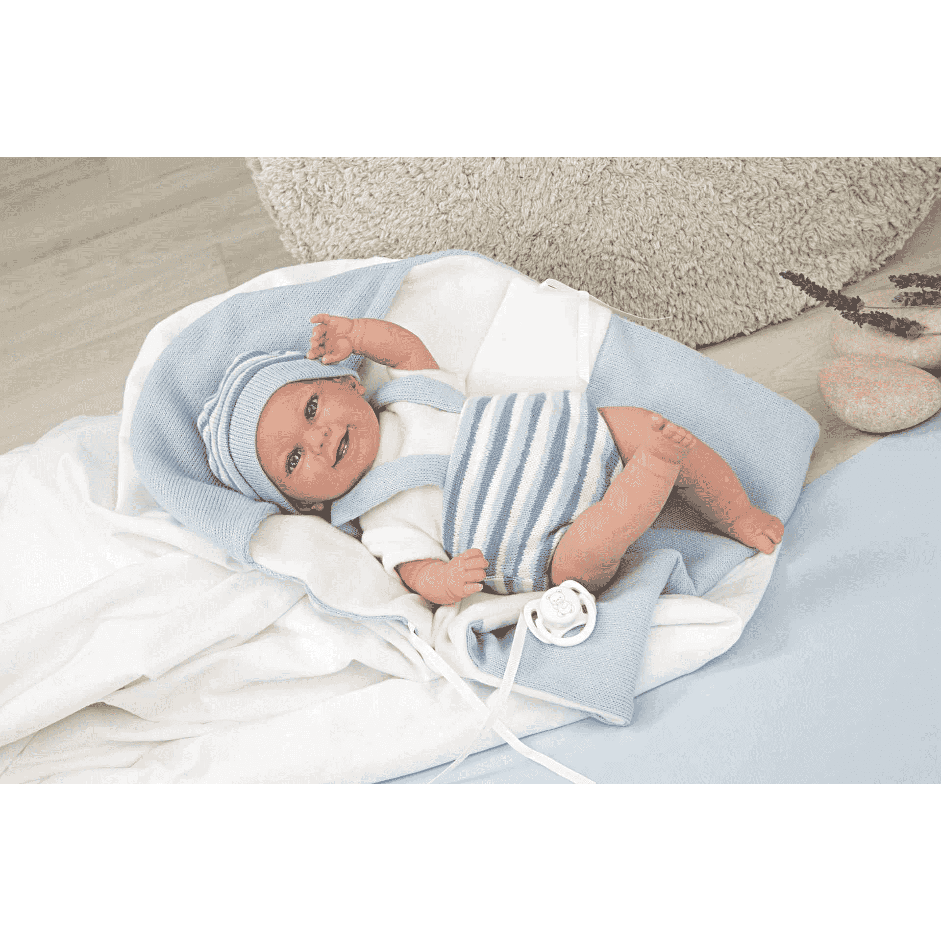 Vestido estampado en tonos azul y blanco, con manta a juego. Su peso es tan real que parece un bebé de verdad. Incluye chupete y manta.