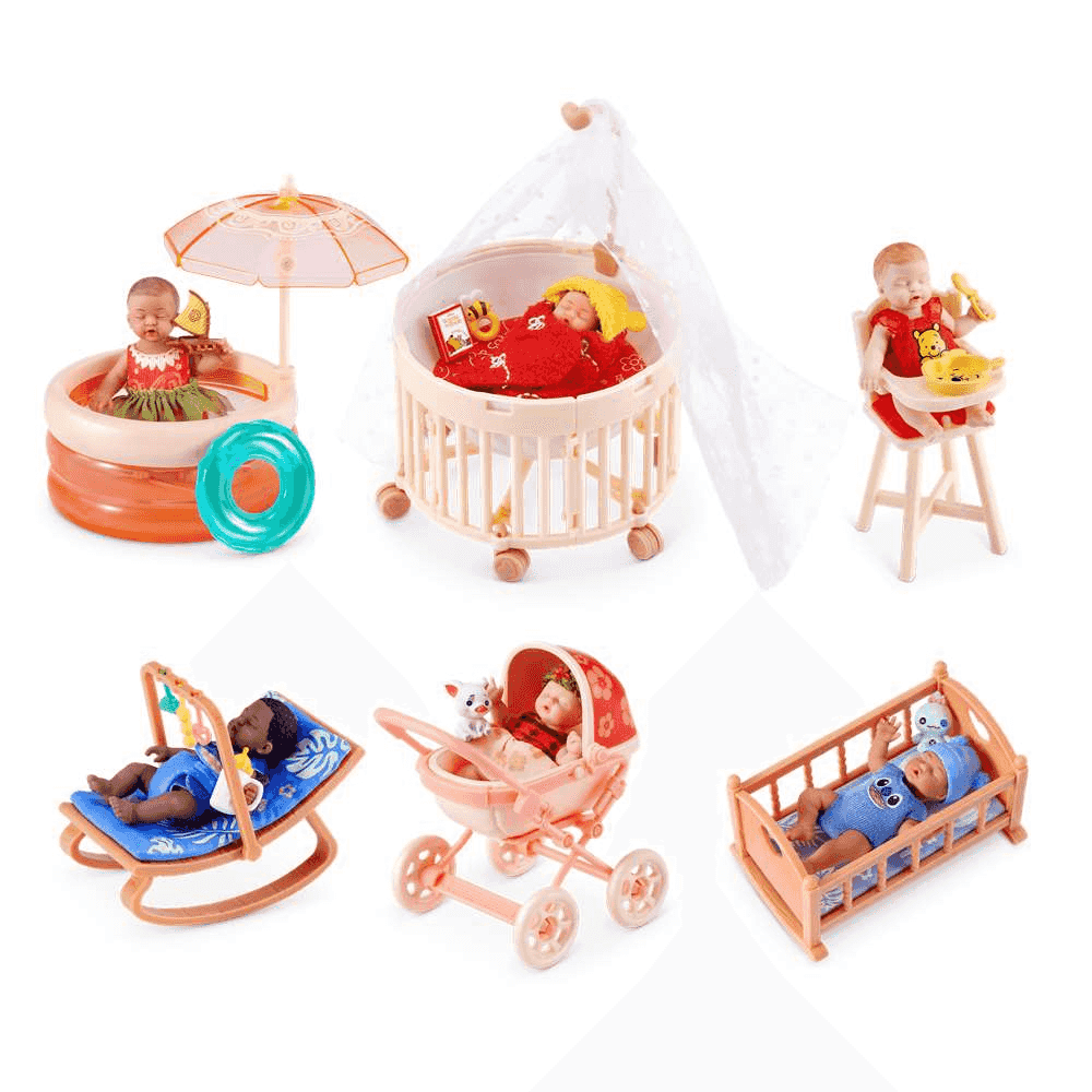 Al abrir la cápsula, se descubre una pequeña historia lista para jugar: cunas, carritos, tronas, hamacas y otros complementos que invitan a imaginar rutinas diarias, fomentando la creatividad y el juego de imitación.