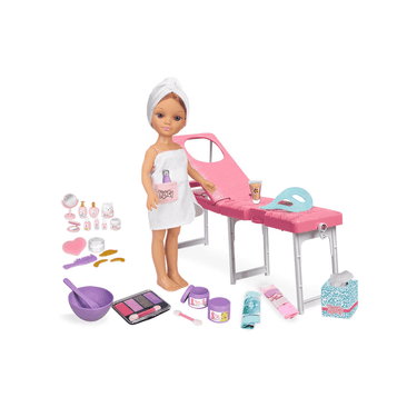Esta muñeca viene con una serie de accesorios los cuales son una cama de spa, cepillos, envases de crema, maquillaje y toallitas. Se debe colocar el juguete acostado sobre la camilla, de manera que puedan aplicarse las cremas en el rostro para poder retirarlas con las toallas.