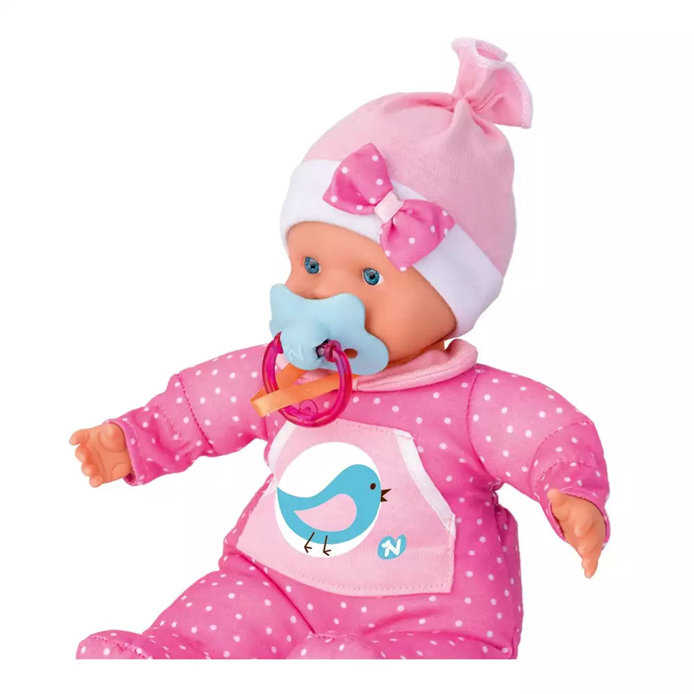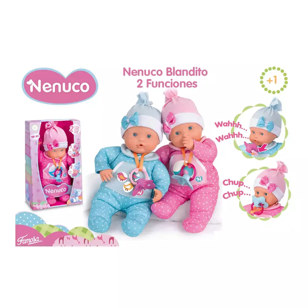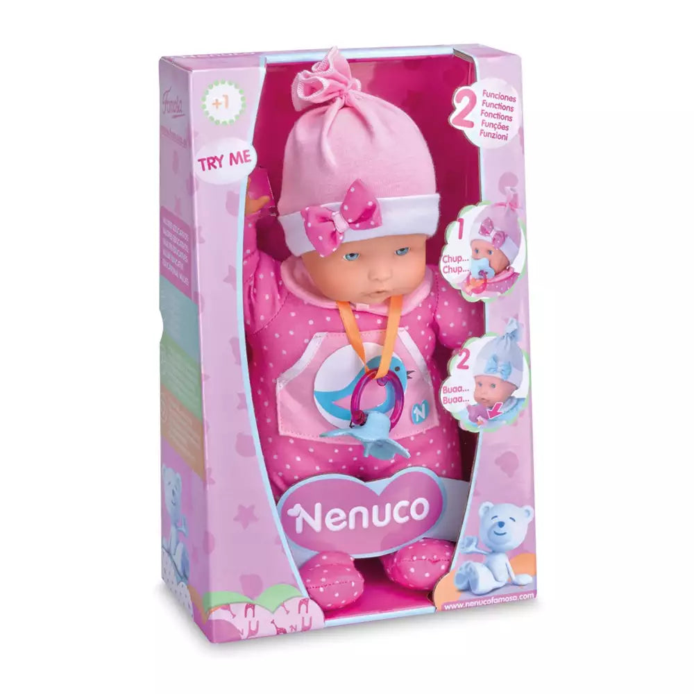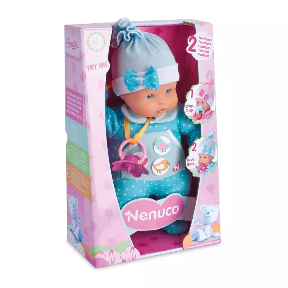 Este Nenuco blandito luce un vestido decorado con pájaros y lleva gorrito a juego. Cuando le das el chupete, hace el sonido tierno de 'chupar', pero si se lo quitas, llora de verdad. Además, como un bebé de verdad, puede meterse el dedo en la boca para consolarse.