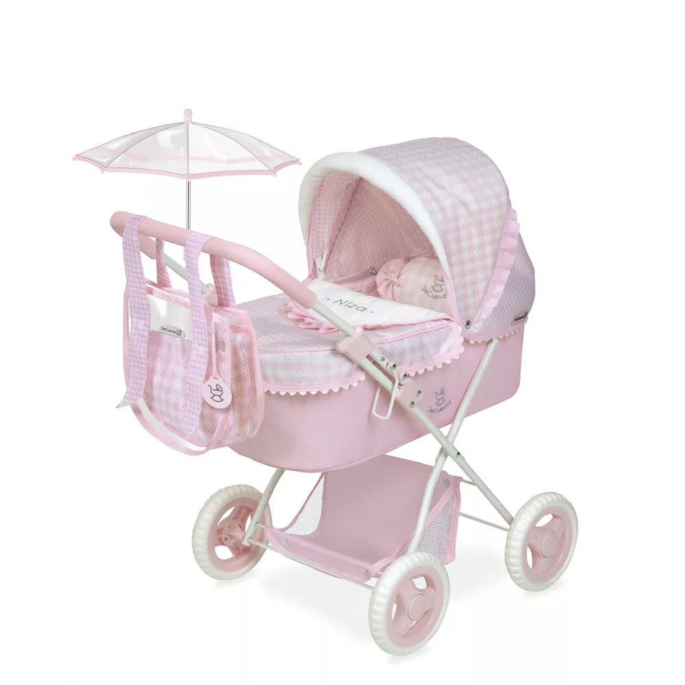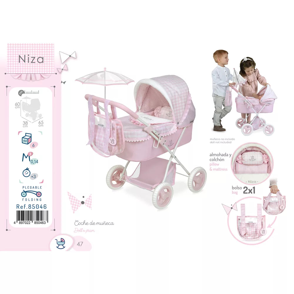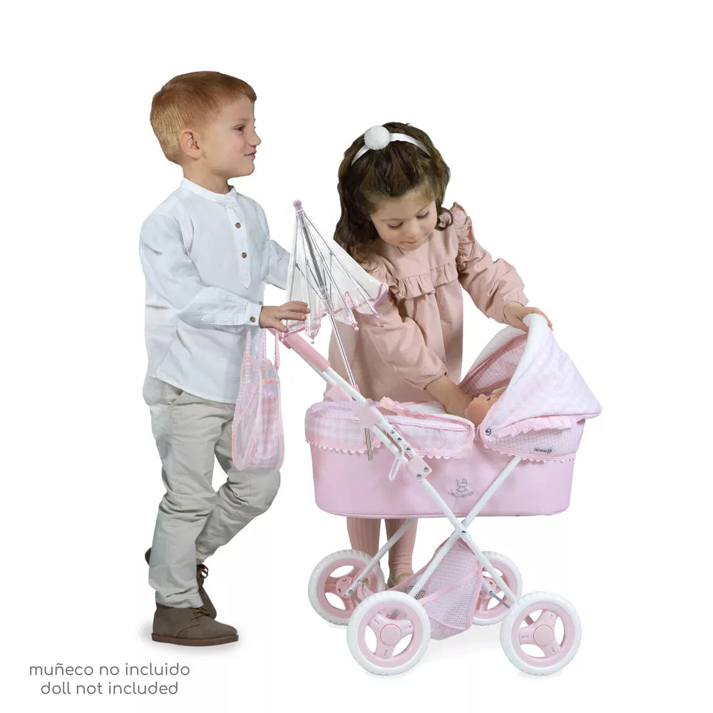 ¿A tu peque le encanta sacar a pasear a sus muñecas? El Coche de Muñecas Niza con capota y sombrilla es ideal para convertir cualquier rincón de casa o el parque en una aventura de cuidado y ternura. Su diseño en tonos rosas con cuadros es un clásico que nunca falla, ¡y viene cargado de detalles que lo hacen único!