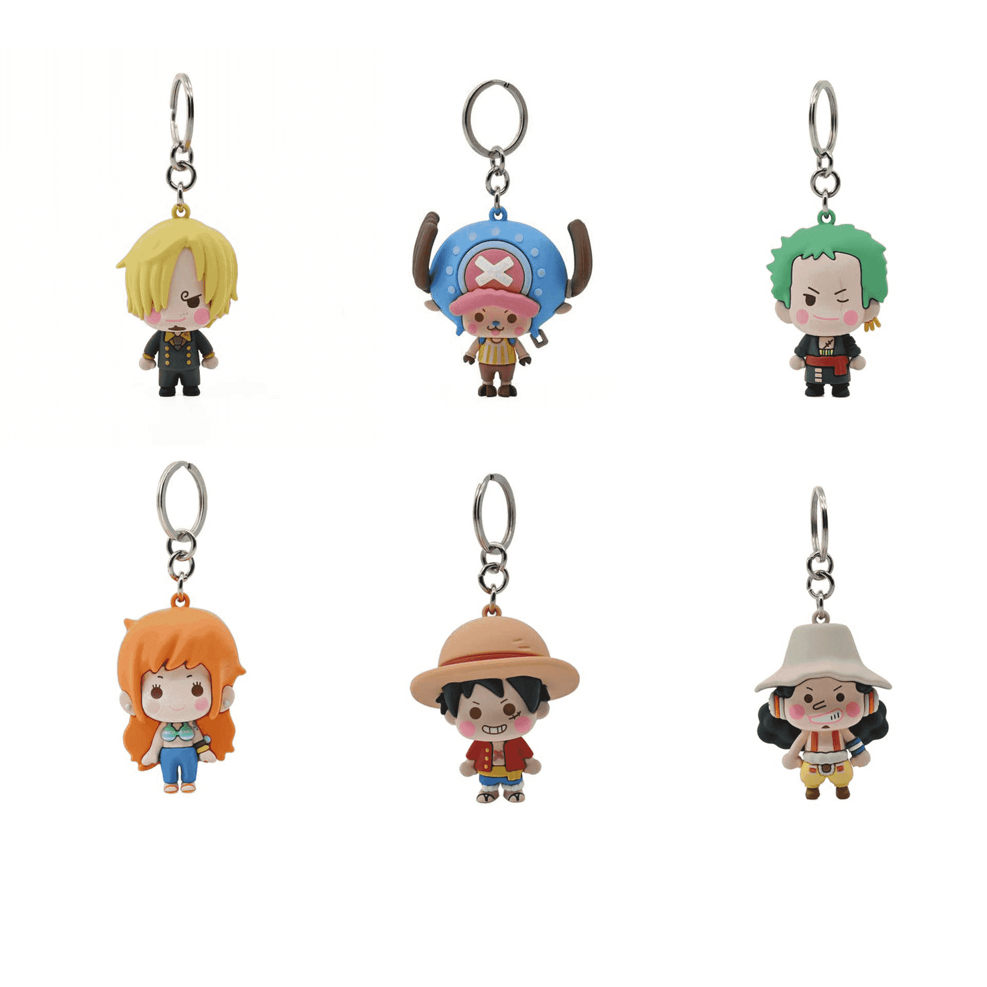 - Diseño 3D detallado: Cada llavero presenta una figura tridimensional cuidadosamente elaborada, representando a personajes como Luffy, Zoro, Nami y Chopper.