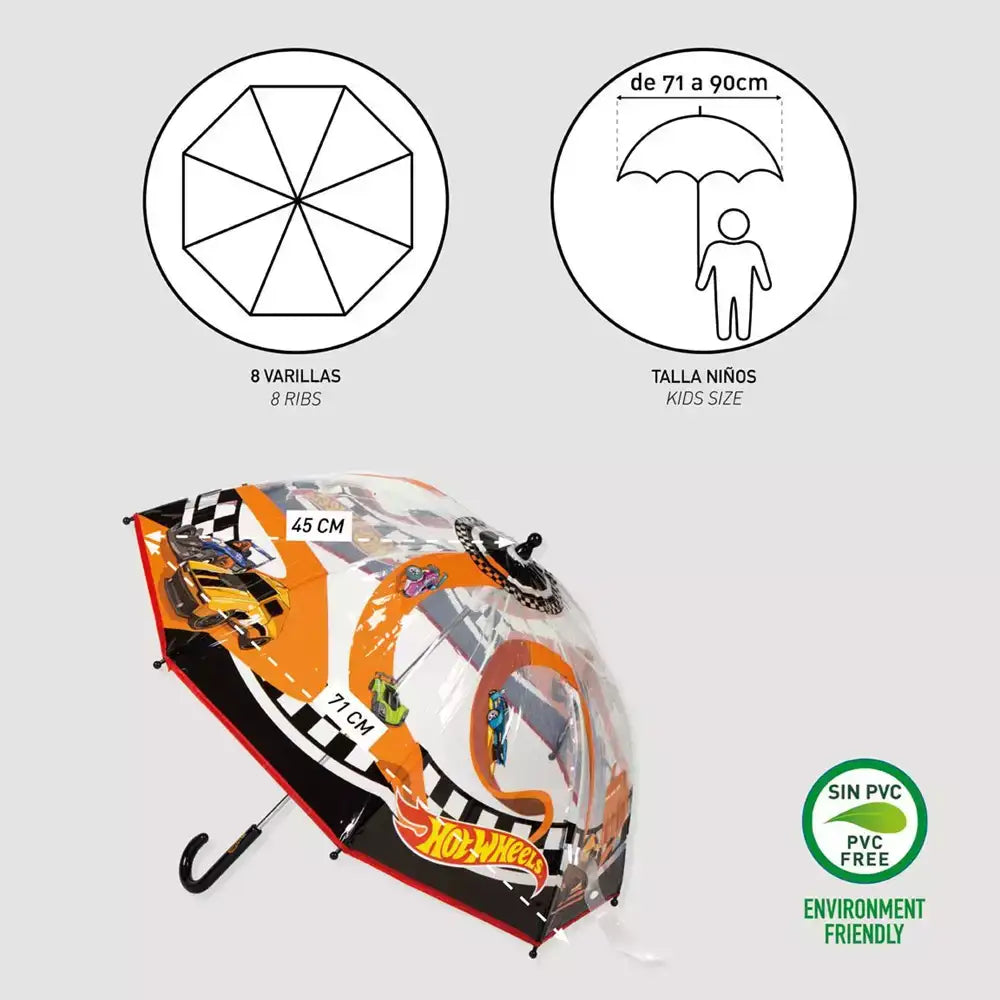 El Paraguas burbuja Hot Wheels es el accesorio perfecto para los peques que adoran los coches y la acción. Fabricado en 100 % POE y con licencia oficial, este paraguas ofrece estilo, protección y diversión bajo la lluvia.