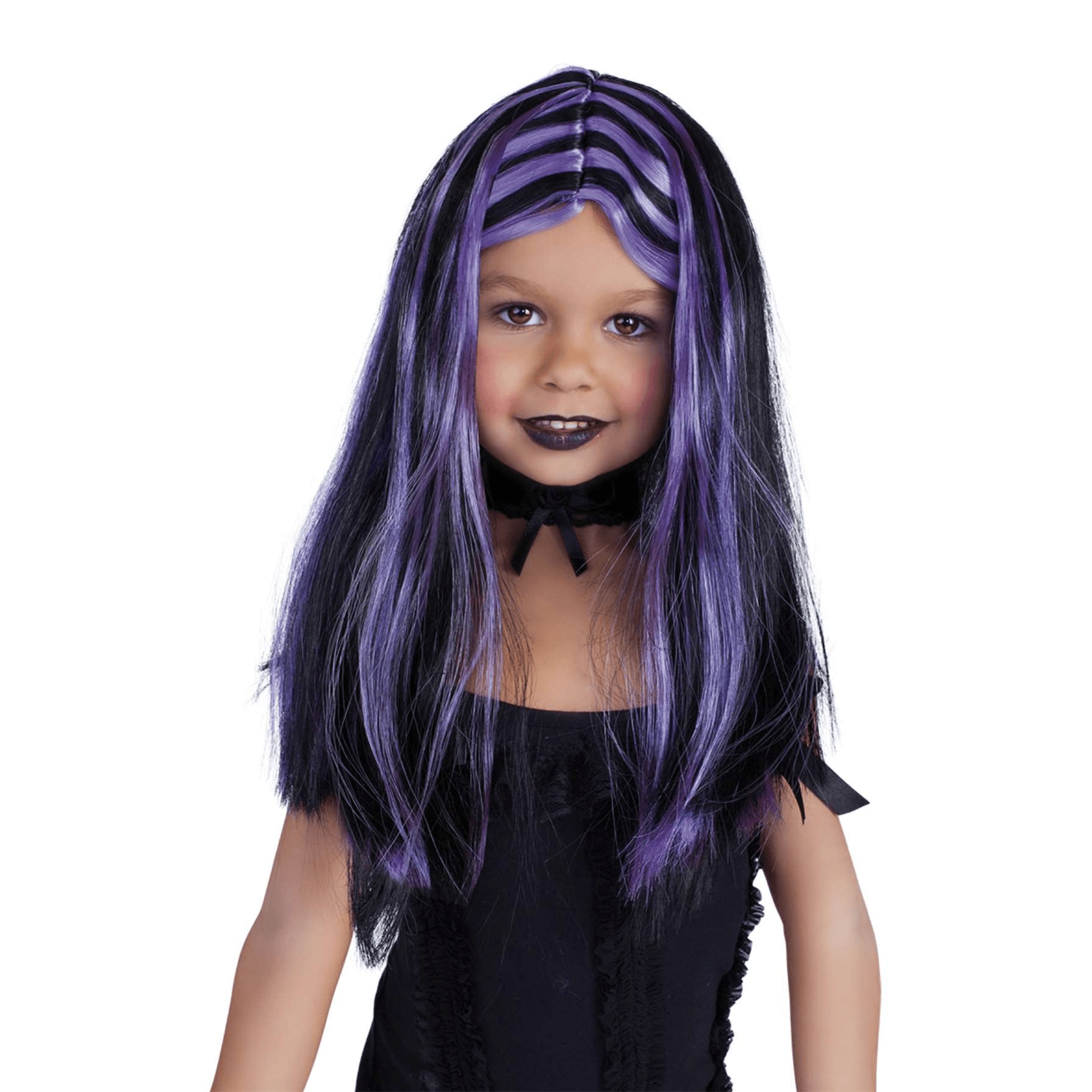 Completa tu disfraz de bruja infantil con esta peluca negra con mechas lilas. Ideal para niñas de 3 a 6 años. ¡Transforma tu look de Halloween!