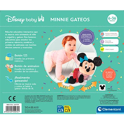 El Peluche Interactivo Baby Minnie Gateos es perfecto para acompañar a los más pequeños mientras comienzan a dar sus primeros pasos. Con este adorable peluche, Baby Minnie gatea y anima a los niños a imitarla, lo que ayuda al desarrollo de sus habilidades motoras de una manera divertida y educativa. Equipado con sonidos y funciones interactivas, este peluche también enseña los primeros números y sonidos de animales mediante sus botones.