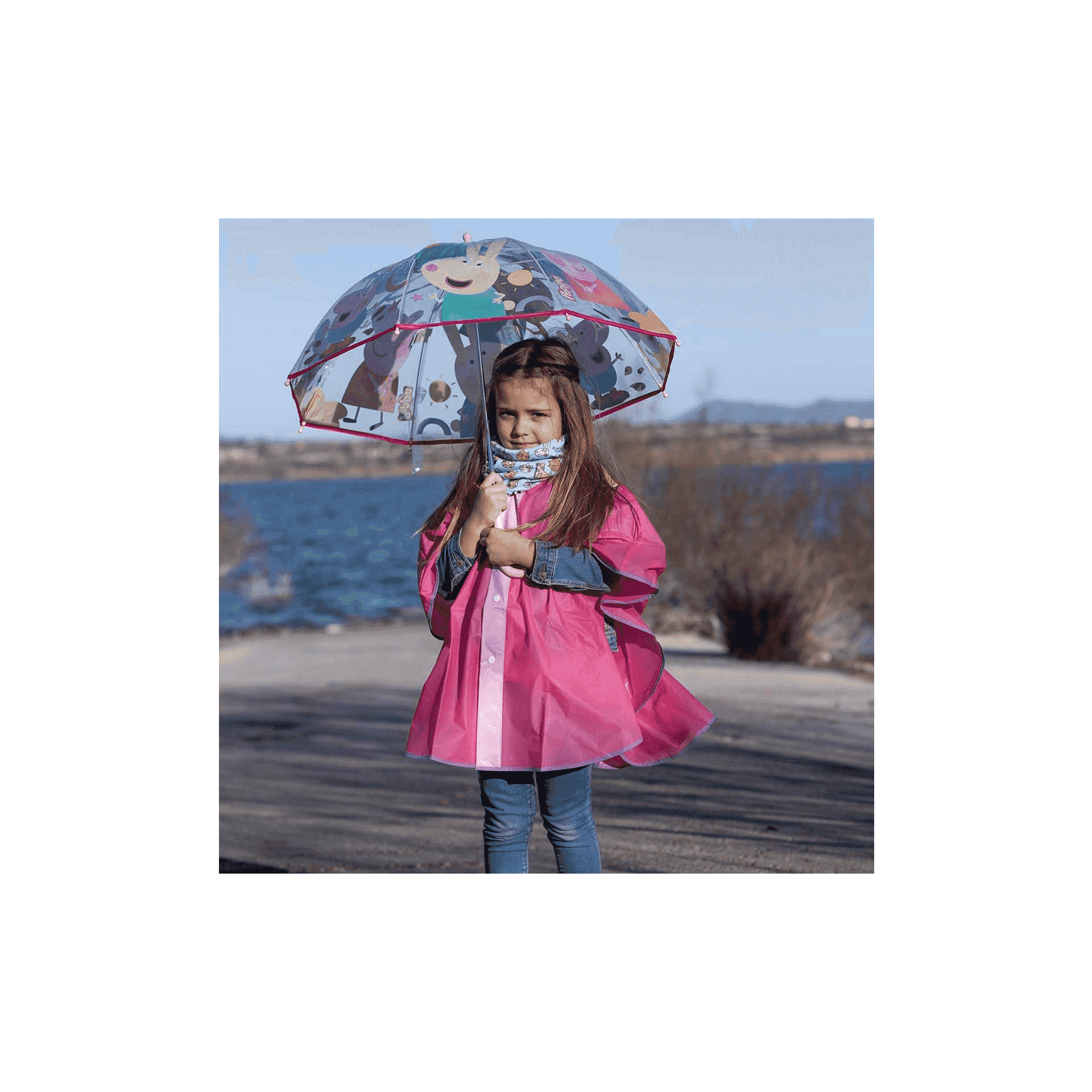 El paraguas Peppa Pig es ideal para niños pequeños, ofreciendo una manera divertida y práctica de mantenerse secos bajo la lluvia. Su diseño de burbuja no solo es funcional sino también seguro, asegurando que los niños estén bien protegidos del viento y la lluvia.