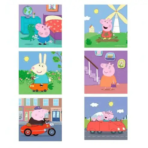 ¡Arma la diversión con Peppa Pig! Este rompecabezas de madera 3×3 incluye seis ilustraciones de tus personajes favoritos del universo de Peppa Pig, ideales para pequeños exploradores.