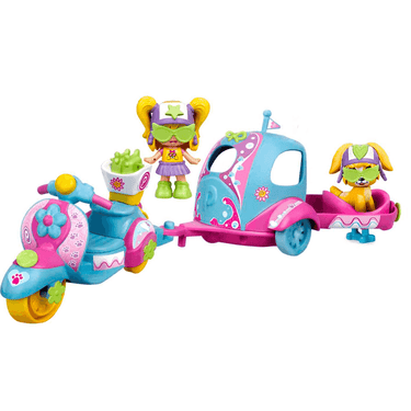 Pack de una figura Pinypon con su cachorro con una moto y remolque.