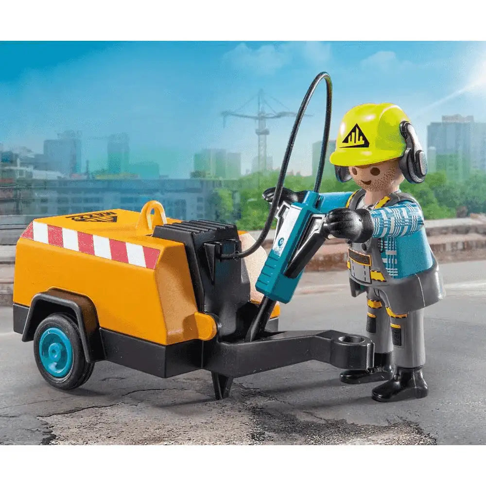 ¿Qué incluye? ¡Es hora de hacer el trabajo con el obrero de la construcción de PLAYMOBIL! El potente cincel se conecta al compresor con una realista manguera de silicona, mientras que el enganche de remolque facilita su transporte a la siguiente obra. El trabajador, equipado con guantes y casco desmontable, está listo para afrontar cualquier tarea. Añade la señal de obra para marcar el área de trabajo y mantener todo seguro.