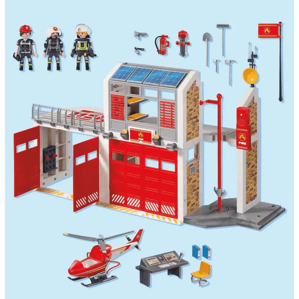 ¿Qué incluye? Con poste para deslizarse, alarma de incendios (2 x 1,5 V pilas necesarias), helicóptero, helipuerto, así como dos garajes para los vehículos. Medidas: 61 x 21 x 36 cm (LxPxA)