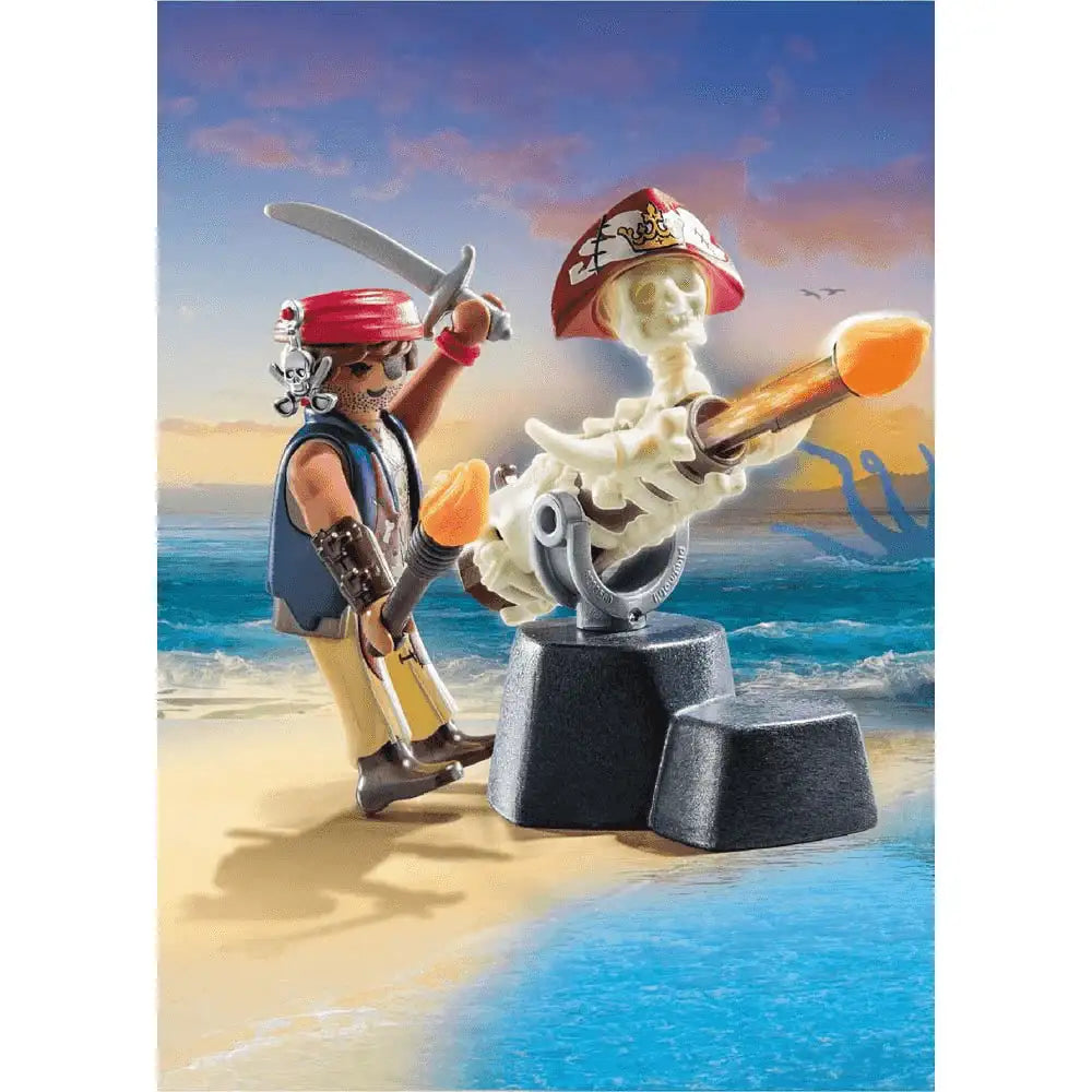 ¿Qué incluye? ¡Cuidado! El valiente pirata carga su cañón y ahuyenta a todos los atacantes y monstruos marinos con sus proyectiles de fuego. Un fantástico set de juego para todos los fanáticos y fanáticas de los piratas a partir de 4 años en adelante. El cañón se encuentra sobre una roca y puede girar y moverse de lado a lado. Las pulseras, los puños de cuero y la banda para la cabeza se pueden quitar de la figura.