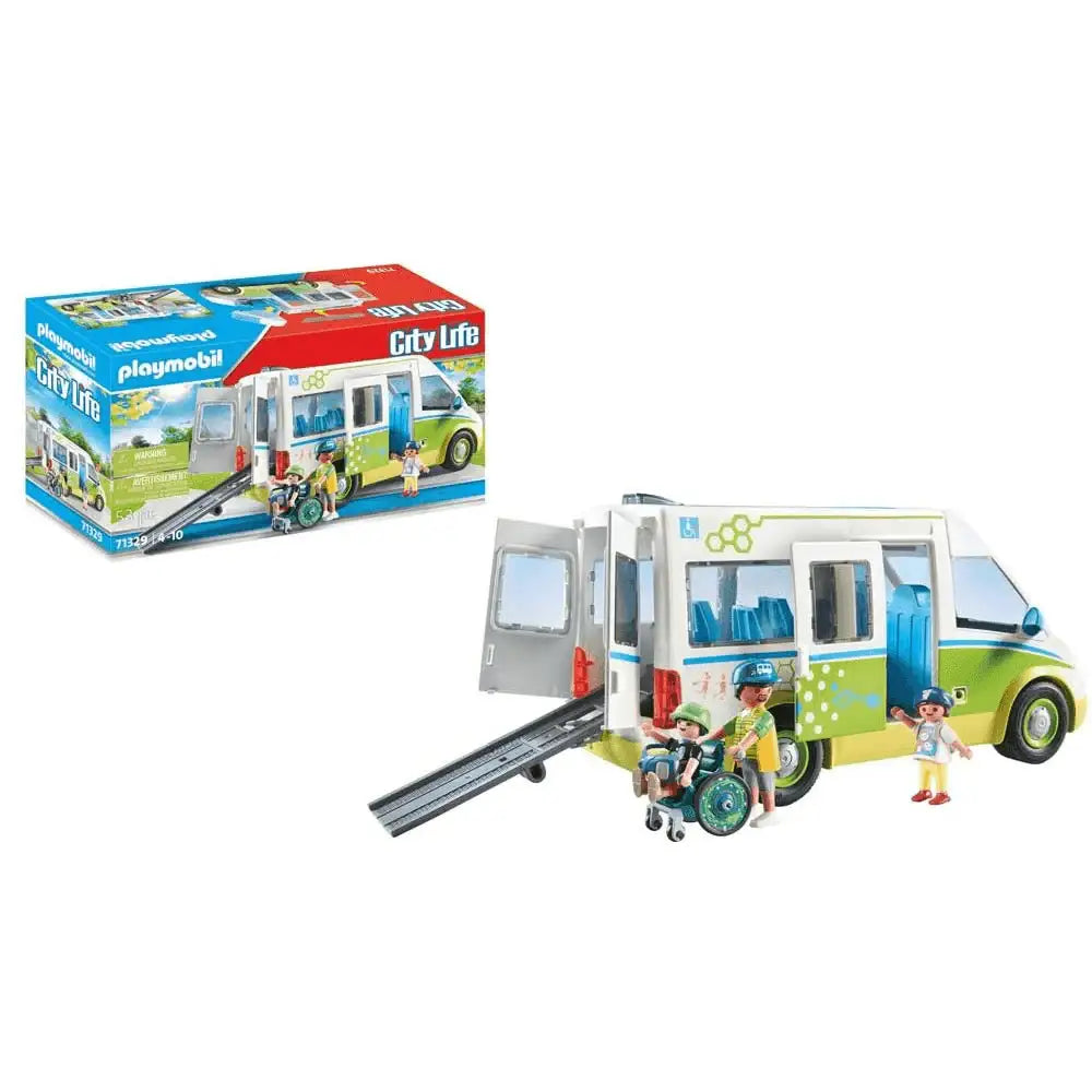 ¿Qué incluye? El Autobús Escolar lleva a todos los niños y niñas de camino al Colegio. Los niños suben por la rampa plegable para sillas de ruedas de las puertas traseras o por la puerta corredera lateral. El techo del autobús escolar puede retirarse para que los niños/as y el conductor puedan ocupar fácilmente sus asientos. Si se necesita más espacio para guardar el equipaje, el autobús escolar también dispone de un enganche para remolque. Con el moderno autobús escolar de PLAYMOBIL, incluso el trayecto al colegio se convierte en toda una experiencia. En el vehículo hay espacio para cinco. Las puertas traseras se pueden abrir. Gracias a la rampa plegable, la silla de ruedas de los niños/as puede introducirse fácilmente en el autobús. Para que sea más fácil jugar con el interior, el techo de la cabina del conductor y la inserción del techo son desmontables. El set incluye tres figuras PLAYMOBIL, un autobús escolar, una silla de ruedas, mochilas y otros fantásticos extras. Un set de juego con un diseño encantador a partir de 4 años.