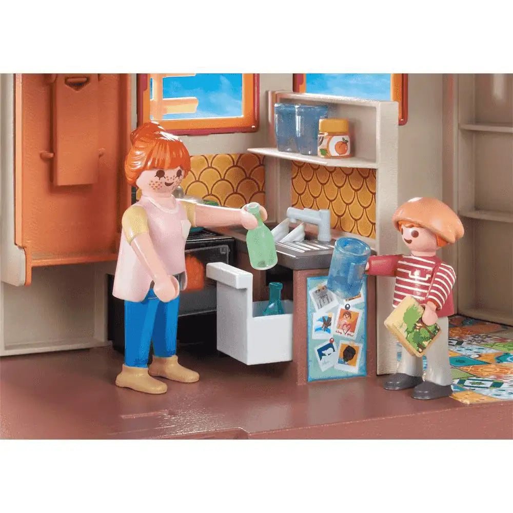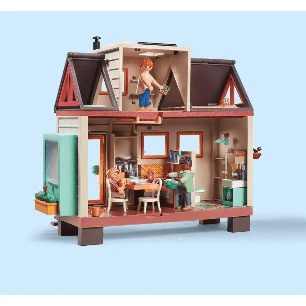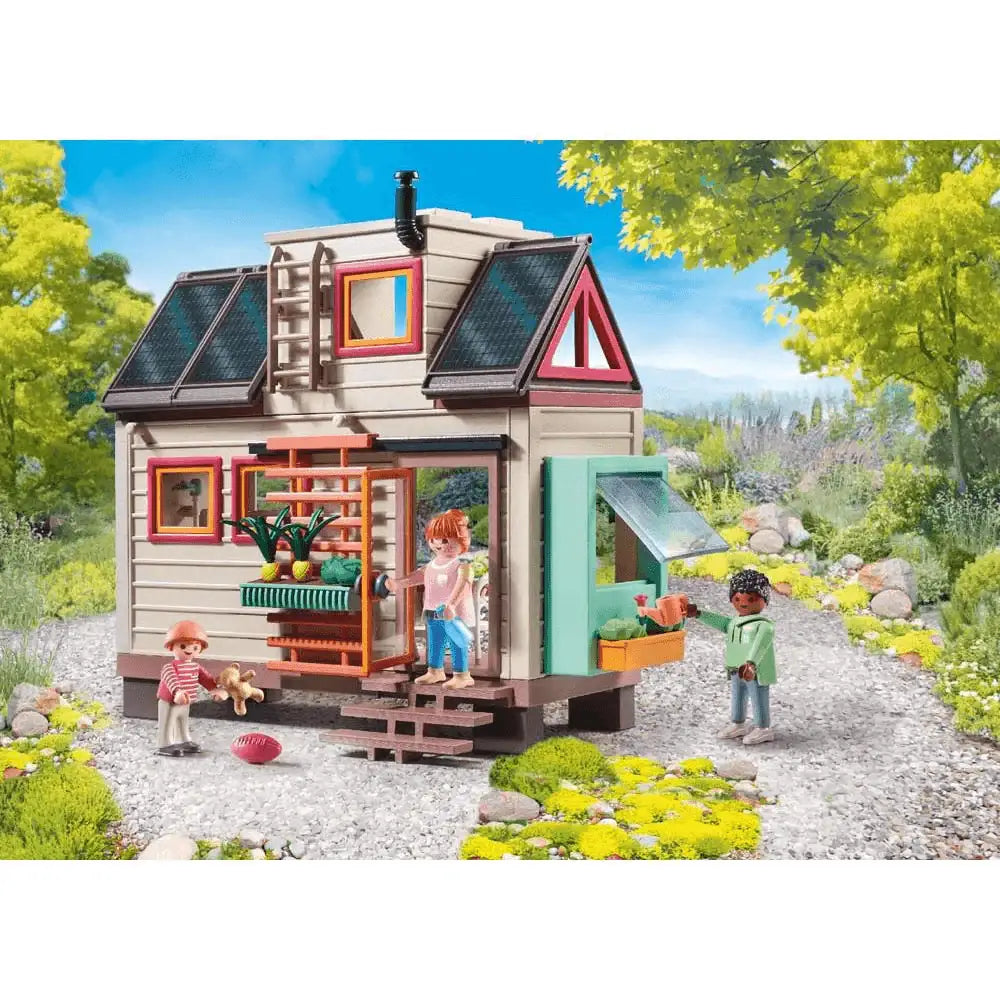 ¿Qué incluye? Casa pequeña, ¡gran diversión! Múdate a tu propio refugio familiar con el sostenible mundo de juego del Tiny House de PLAYMOBIL. El Tiny House ofrece todo lo que tu corazón desea: en la planta baja, está el área de comedor y cocina con una estufa, fregadero y nevera, así como una mesa plegable, y el baño con ducha y retrete. La escalera plegable lleva al ático. Aquí, se encuentra una habitación para niños y dos espacios para dormir para adultos. En el exterior, un jardín vertical y una jardinera permiten cultivar frutas y verduras para uso personal, y paneles solares en el techo apoyan el suministro de energía. ¡Esta pequeña casa no deja ningún deseo de vida sin cumplir! Especificaciones: - Set de juego diseñado con tres figuras de PLAYMOBIL, una mini casa de dos pisos con cocina, baño, ático y mobiliario, así como numerosos accesorios para divertidos juegos de roles familiares. - Decoración creativa: La casa se puede decorar de forma individual con plantillas de papel tapiz descargables. - PLAYMOBIL Tiny House está fabricado con más de un 80% de productos sostenibles.