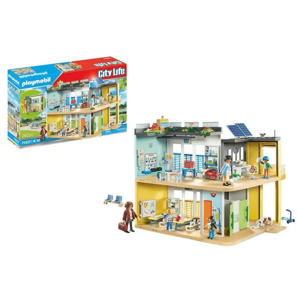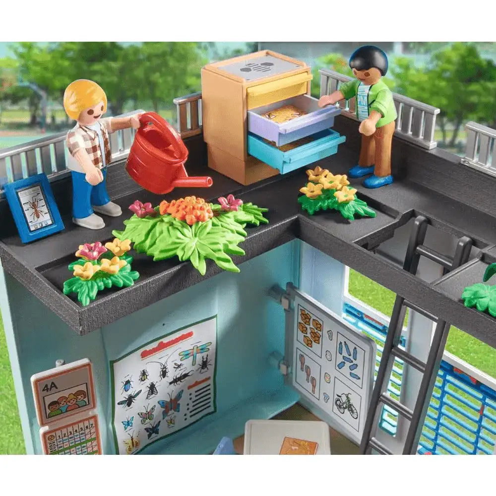 ¿Qué incluye? En el Colegio siempre pasa algo: Los niños aprenden cosas en las distintas aulas, con la pizarra móvil e interactiva y las hojas de trabajo que se pueden pintar, la diversión está garantizada. En la azotea verde se pueden observar insectos y abejas. El Colegio cuenta con un aseo accesible en silla de ruedas y un ascensor. Así que el edificio no tiene barreras. ¿Y qué es eso? ¿Ese perro se está comiendo los deberes? El Colegio de PLAYMOBIL es el juego perfecto para que niños y niñas con mentes inquietas y que sientan pasión por el aprendizaje. Un gran regalo a partir de 4 años. El set de juego incluye dos figuras PLAYMOBIL y cuatro figuras infantiles, un edificio de dos plantas con ascensor y azotea, un perro y un montón de accesorios temáticos para recrear emocionantes días de escuela en casa.